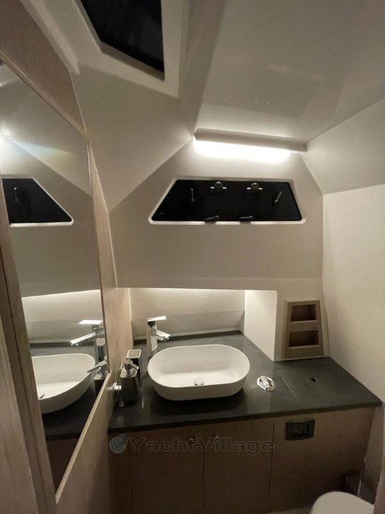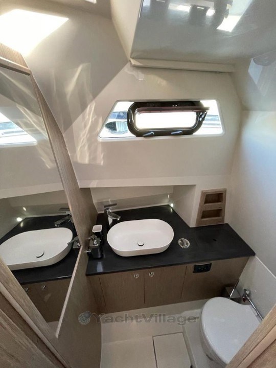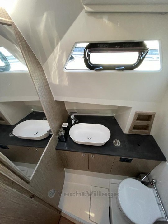 La console arrière intègre un évier design, un plan de travail fonctionnel, un compartiment de rangement pratique, ainsi qu’un grand réfrigérateur à tiroir. Un second espace réfrigéré, astucieusement dissimulé sous une assise du carré arrière, complète cet aménagement. Une machine à café premium est disponible à bord, alimentée en toute autonomie grâce à un convertisseur.