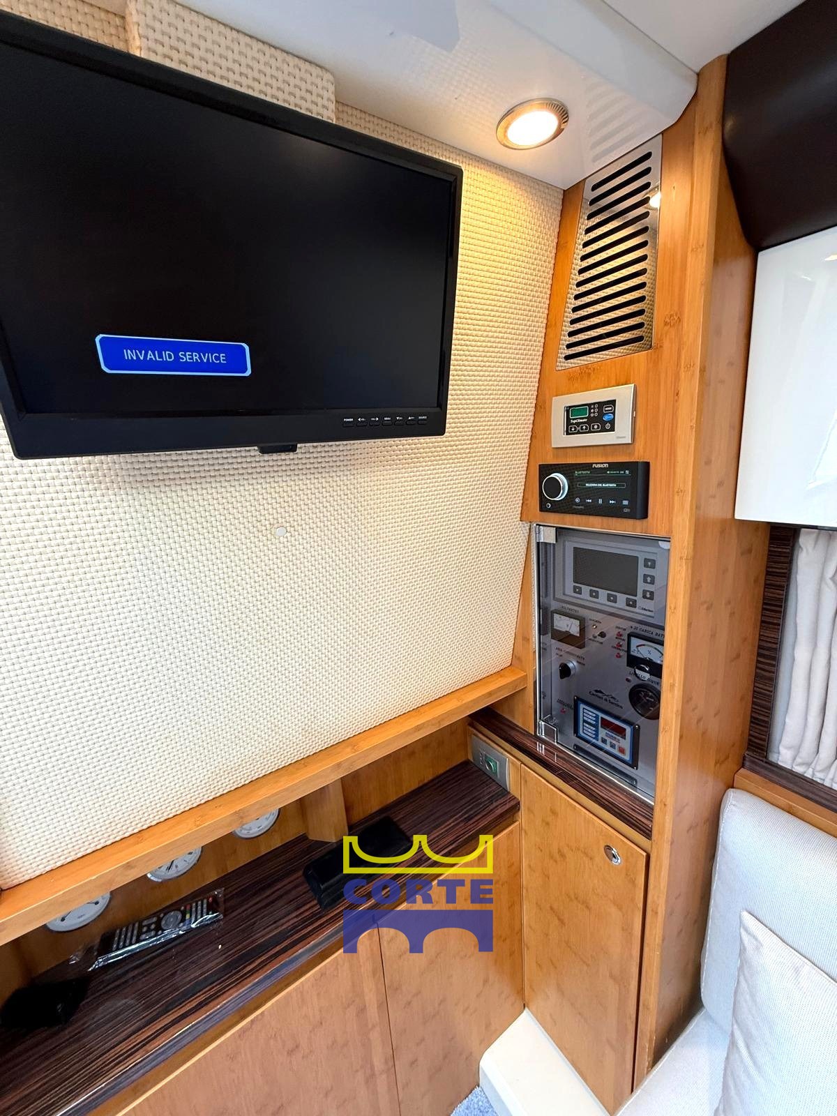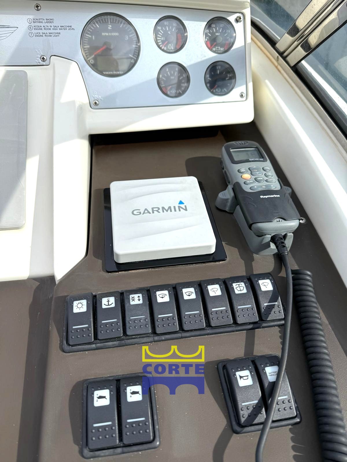 Instrumentation électronique du moteur, manœuvres par joystick ; échosondeur et rondin (Raymarine) ; Traceur GPS ; Pilote automatique (Garmin) ; VHF; Boussole; Angle de gouvernail