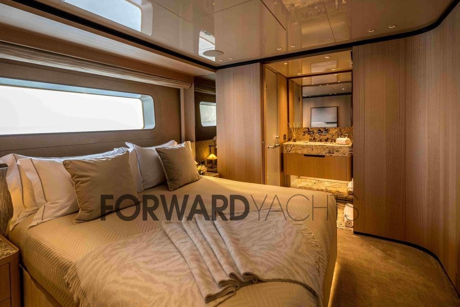 Le yacht présente une disposition sophistiquée avec des matériaux de haute qualité et peut accueillir jusqu’à 10 passagers dans cinq cabines attenantes, dont une suite principale sur le pont principal à pleine largeur.