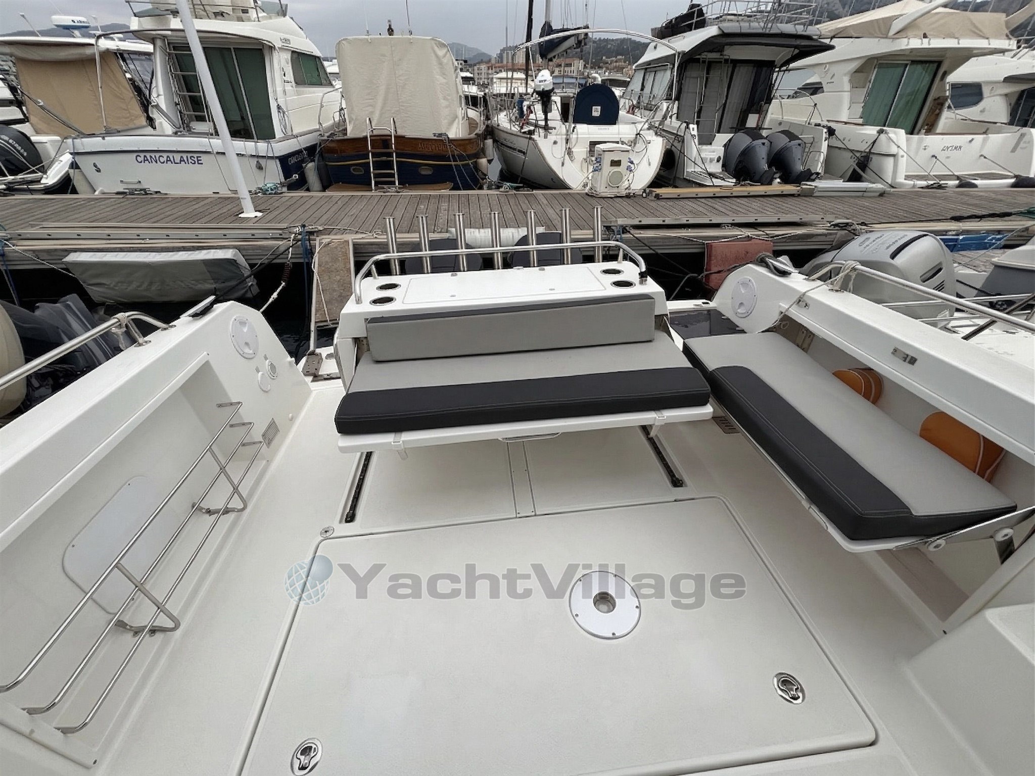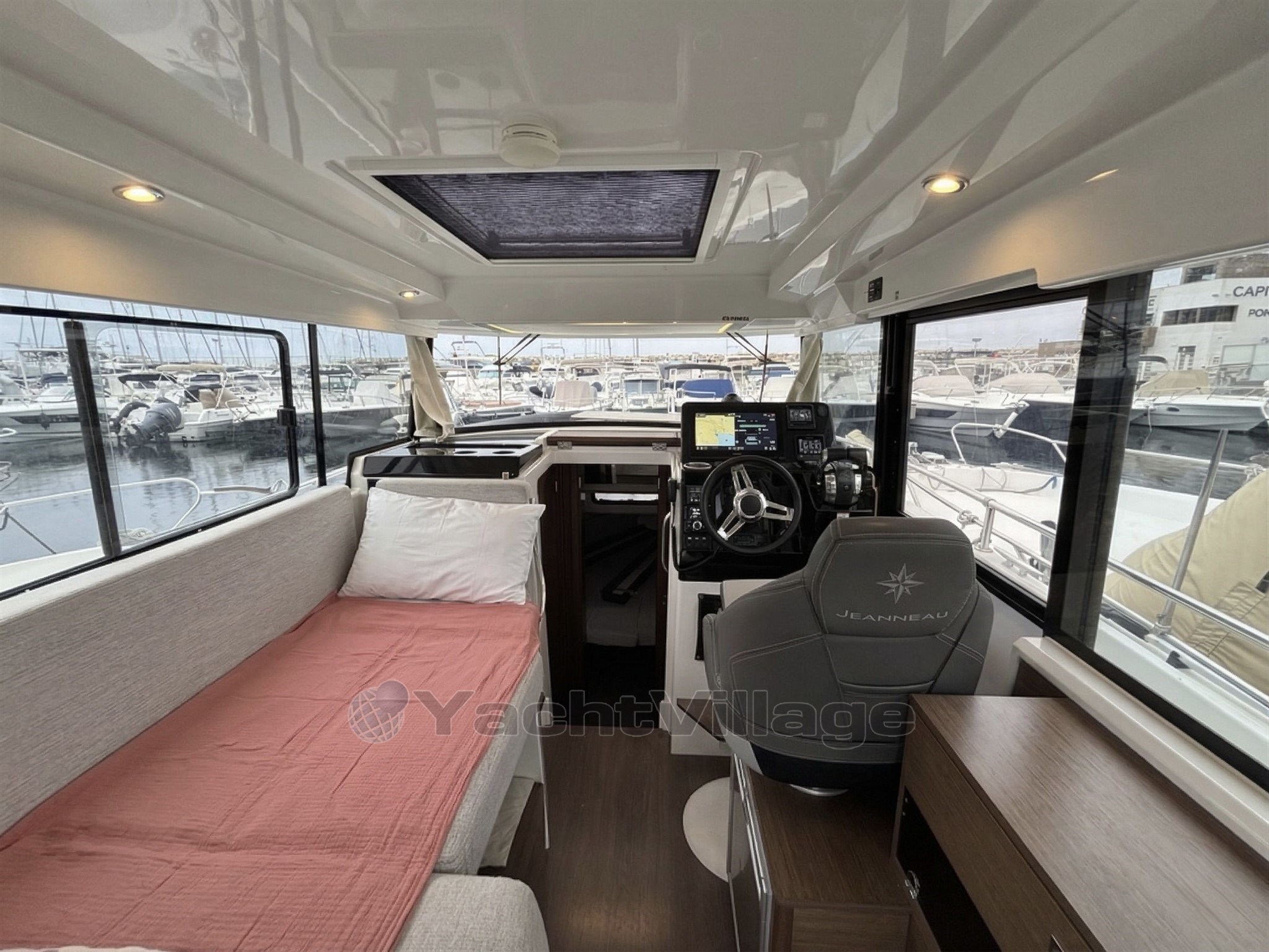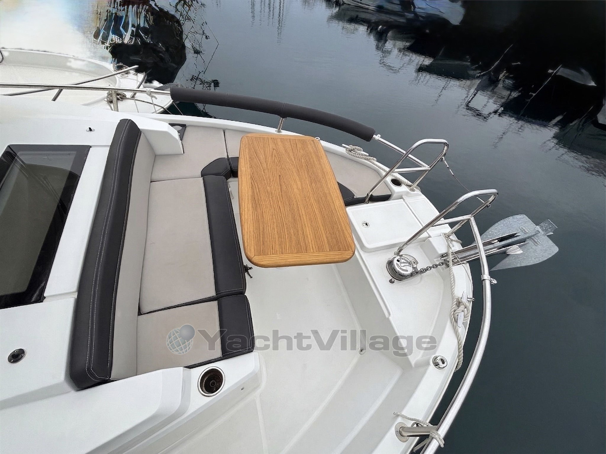 Le cockpit est entièrement modulable et parfaitement adapté à un usage polyvalent, avec table en teck, banquette latérale rabattable, coussins de bain de soleil avant, nombreux rangements et galerie pour paddle. Le bateau est également équipé d’un véritable pack pêche comprenant vivier avec pompe de circulation eau de mer et système de lavage de pont.