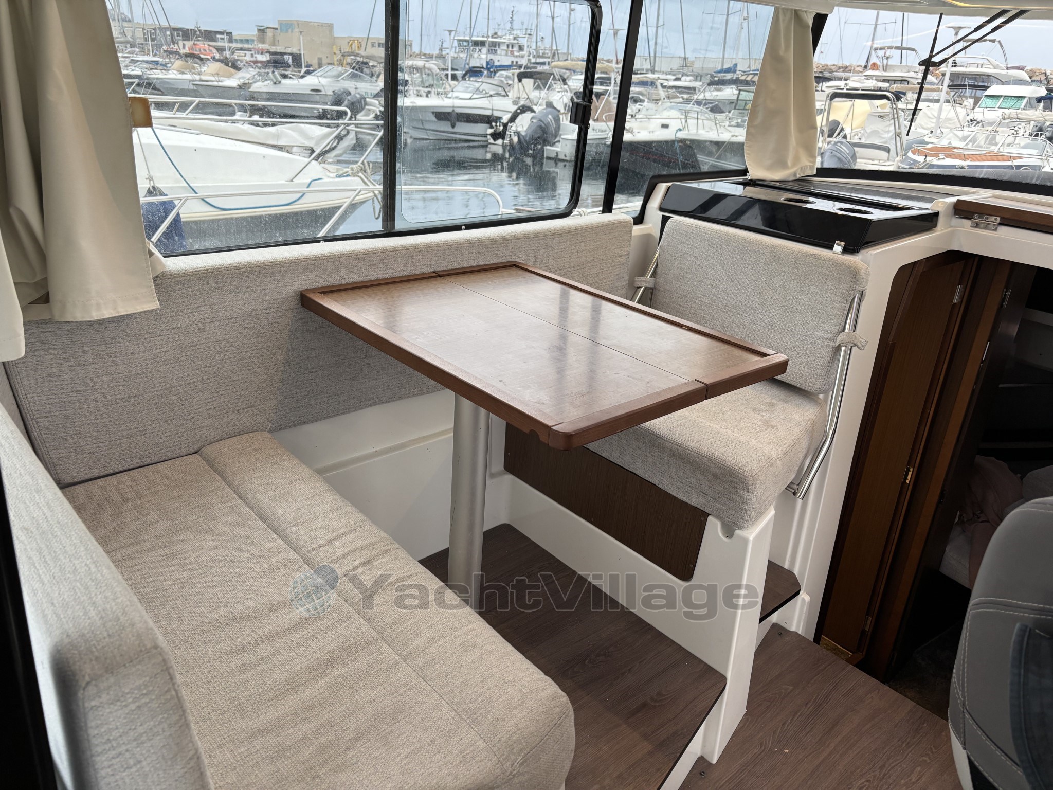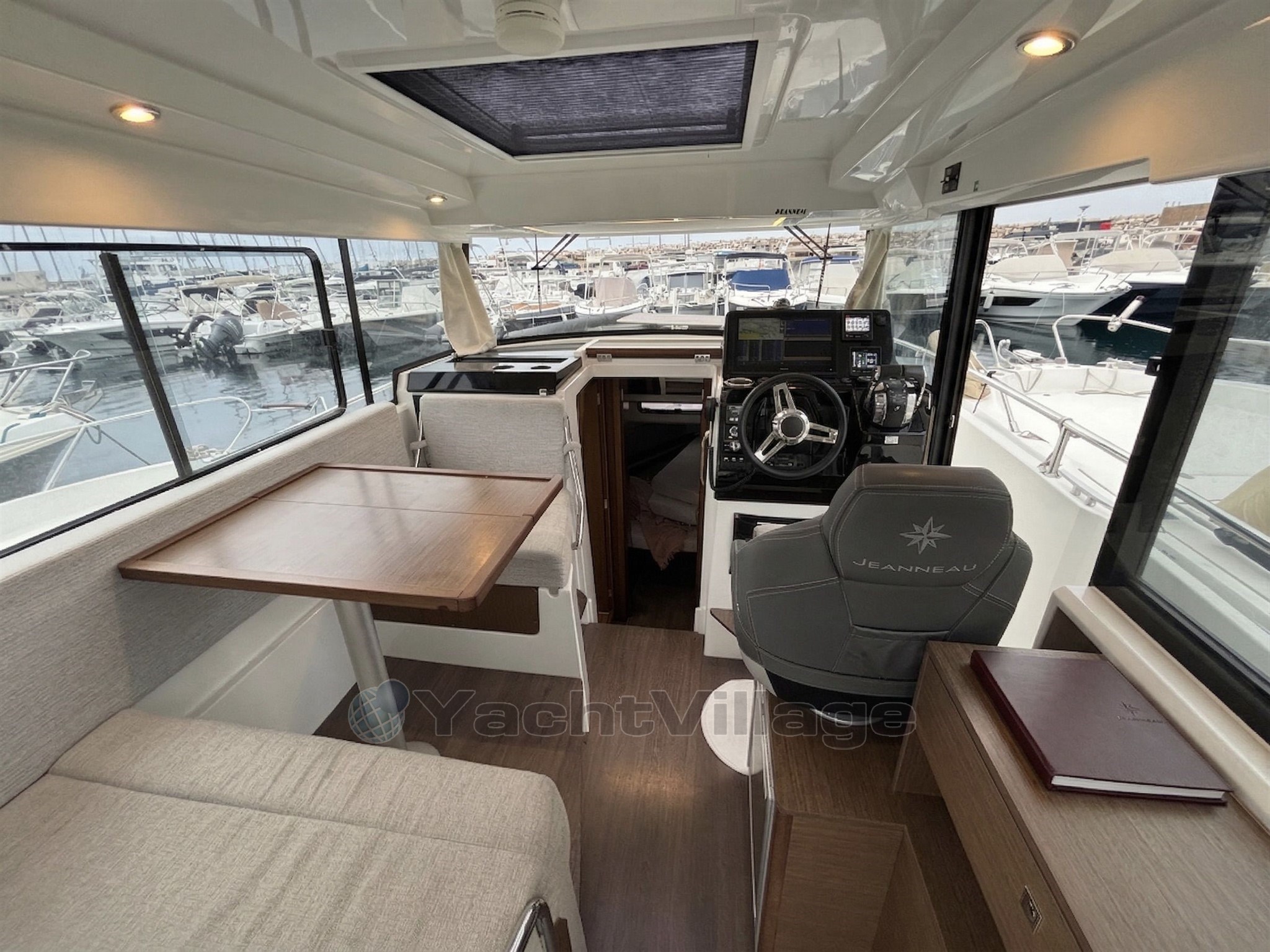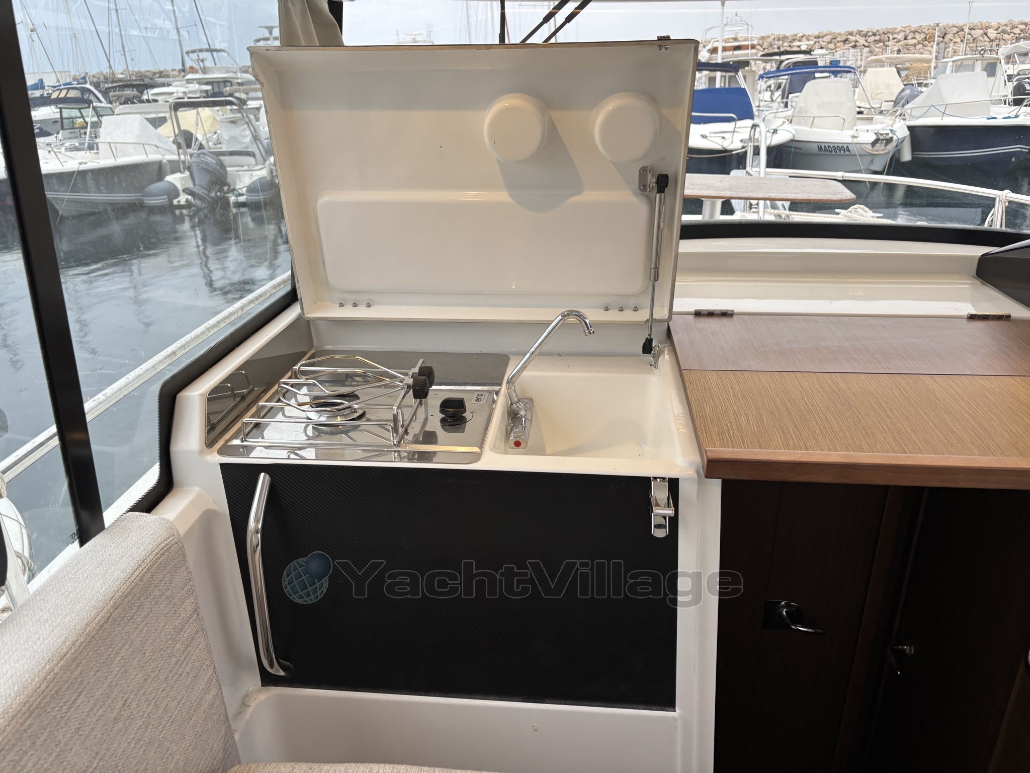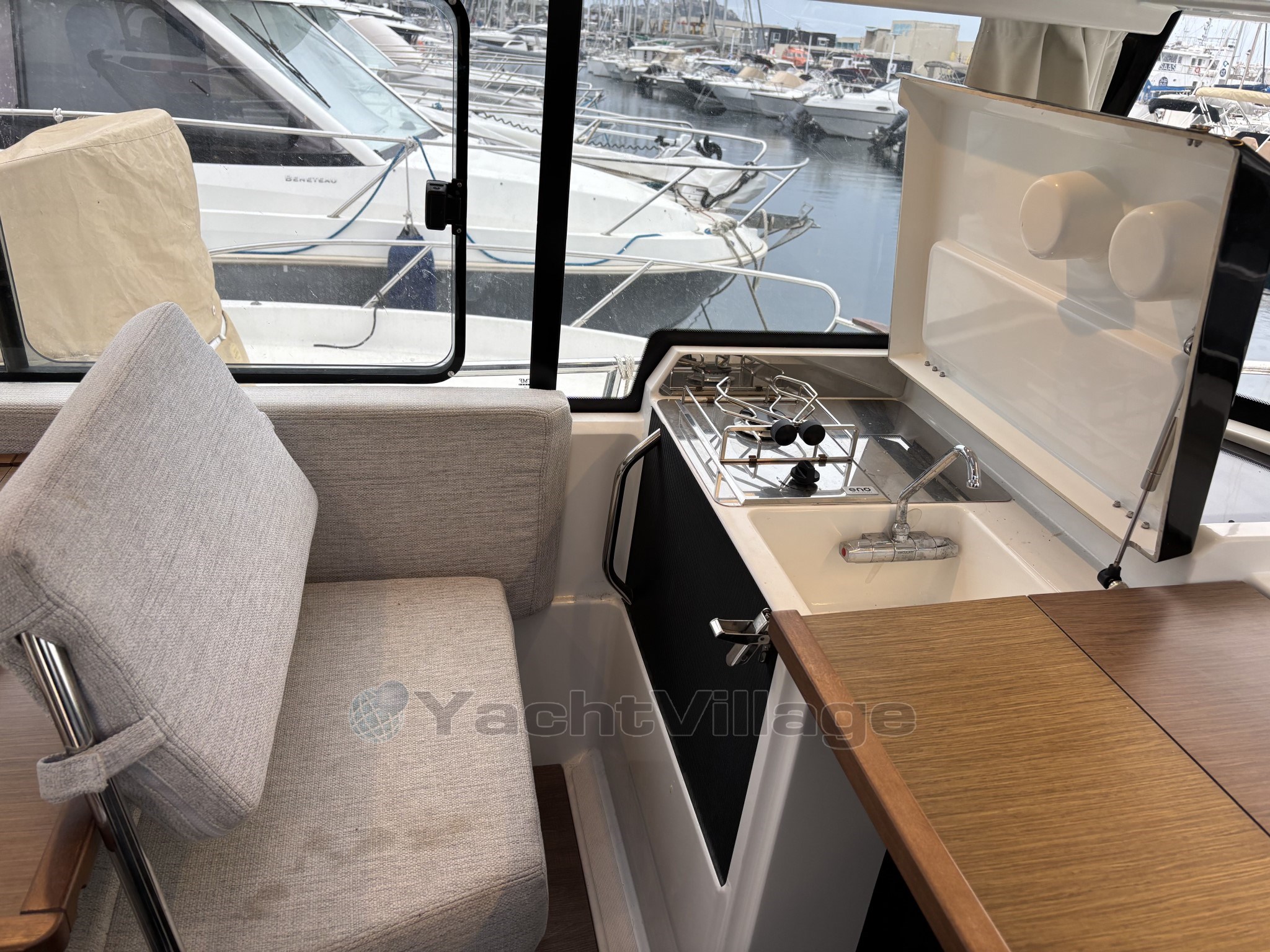 Le cockpit est entièrement modulable et parfaitement adapté à un usage polyvalent, avec table en teck, banquette latérale rabattable, coussins de bain de soleil avant, nombreux rangements et galerie pour paddle. Le bateau est également équipé d’un véritable pack pêche comprenant vivier avec pompe de circulation eau de mer et système de lavage de pont.