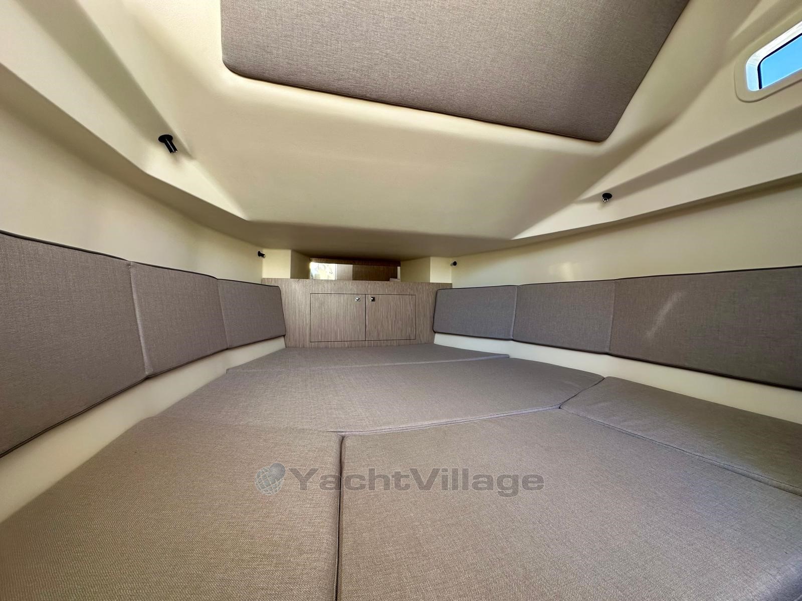 Modello alimentato da 2 motori YAMAHA da 300 cv, di colore bianco, con sterzo elettrico. Opzioni principali: Hard top, joystick YAMAHA con pilota automatico e ancora virtuale, pozzetto flessibile, tendalino parasole su pali carcbone anteriori e posteriori, doccetta interna, presa di corrente, luci subacquee, GPS/Ecoscandaglio GARMIN 9".