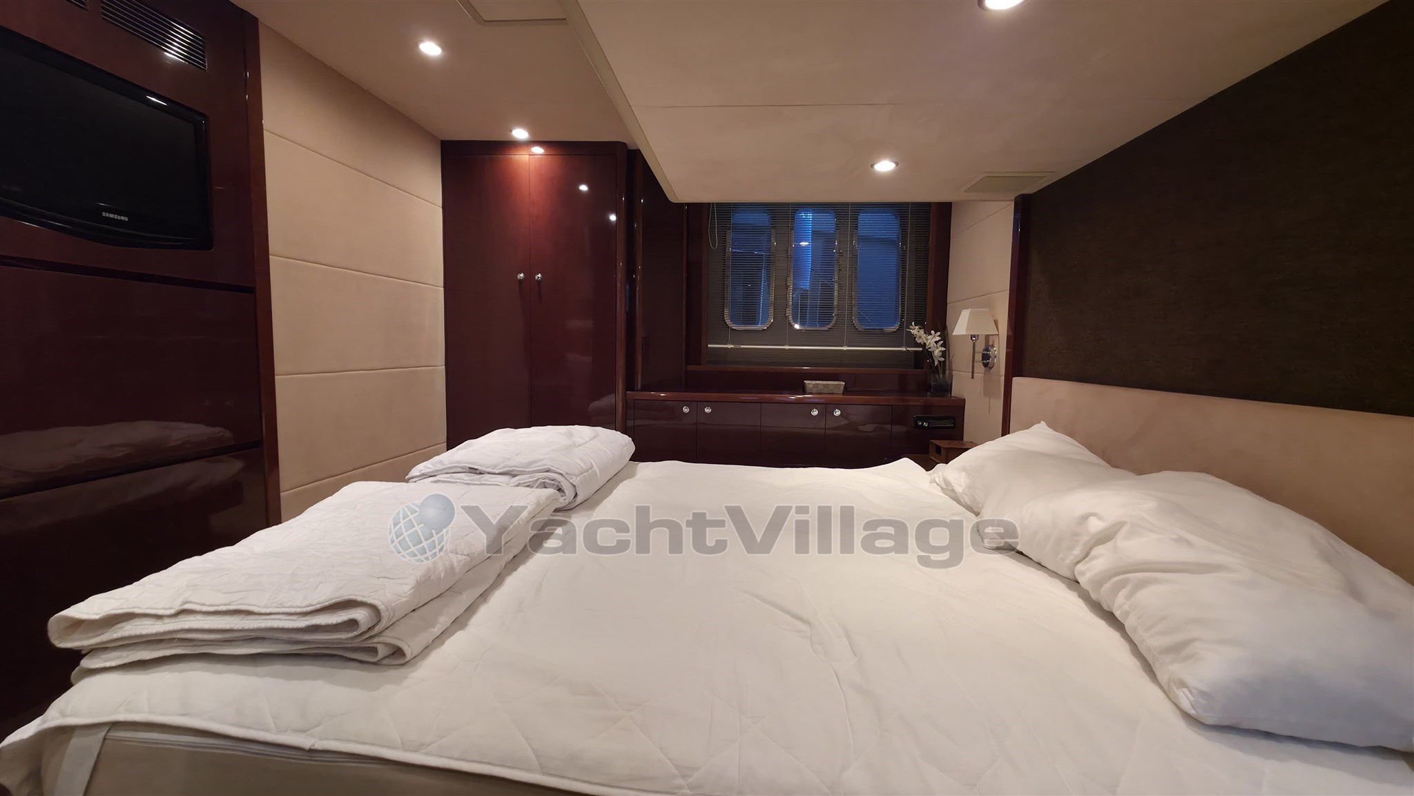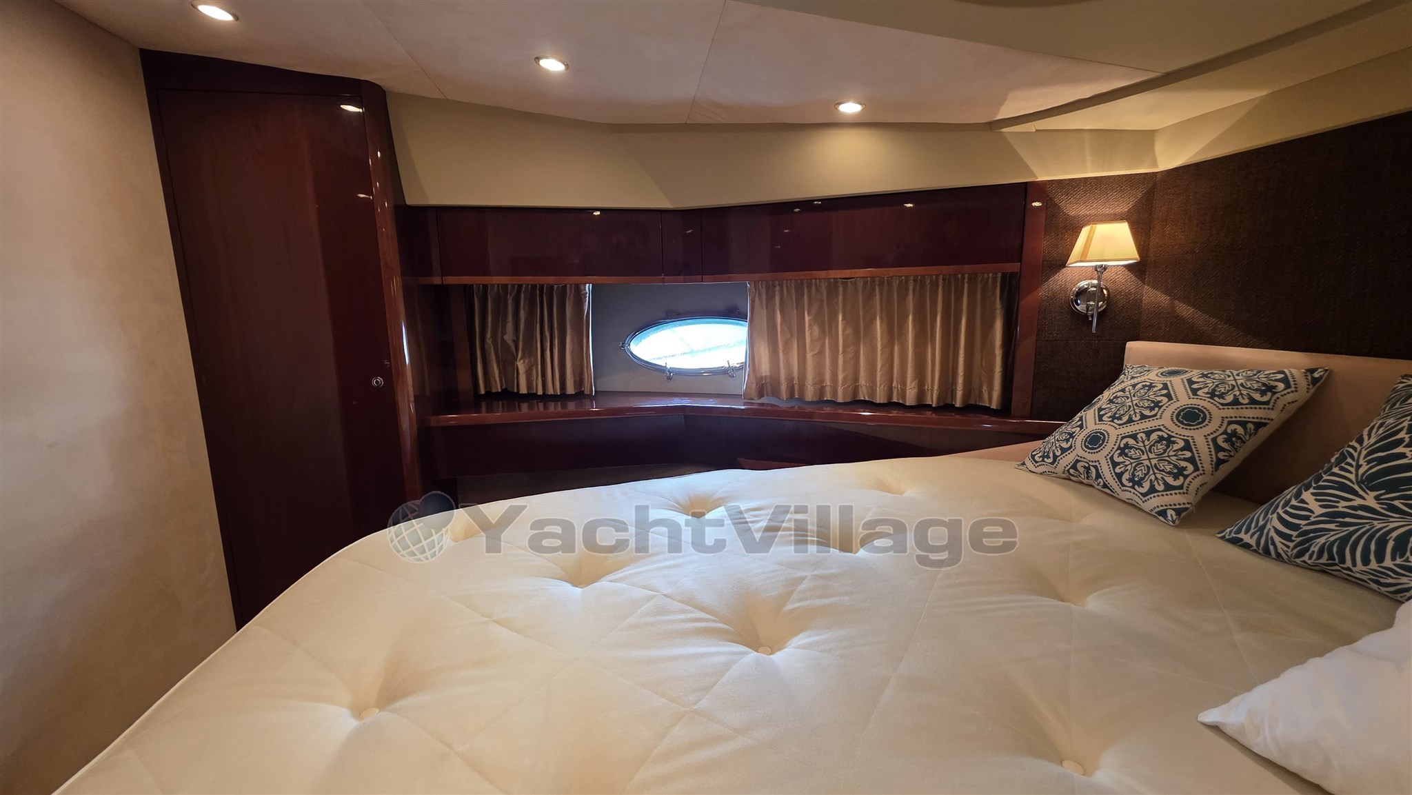 cabina padronale (doppia centrale), cabina VIP (doppia a prua), cabina ospiti (laterale, letto, letti a castello), cabina dell'equipaggio,