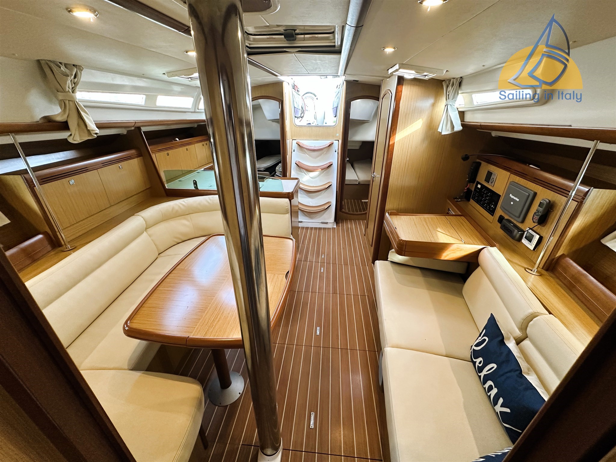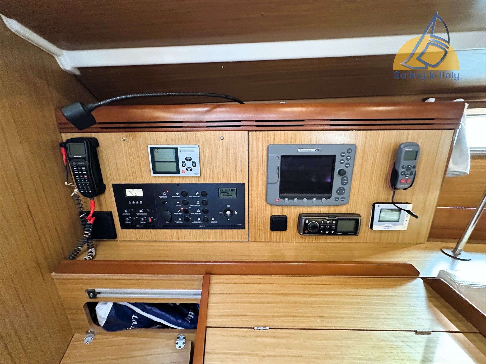 Strumentazione Raymarine completa: 2 bussole ; ecoscandaglio ; log ; GPS ; VHF ; pilota automatico ; stazione vento ; plotter Aixiom touch con antenna GPS ; Stereo AM/FM con altoparlanti interni/esterni ; Controller Fusion in Pozzetto ; Autoclave; impianto acque nere doppio; boiler;