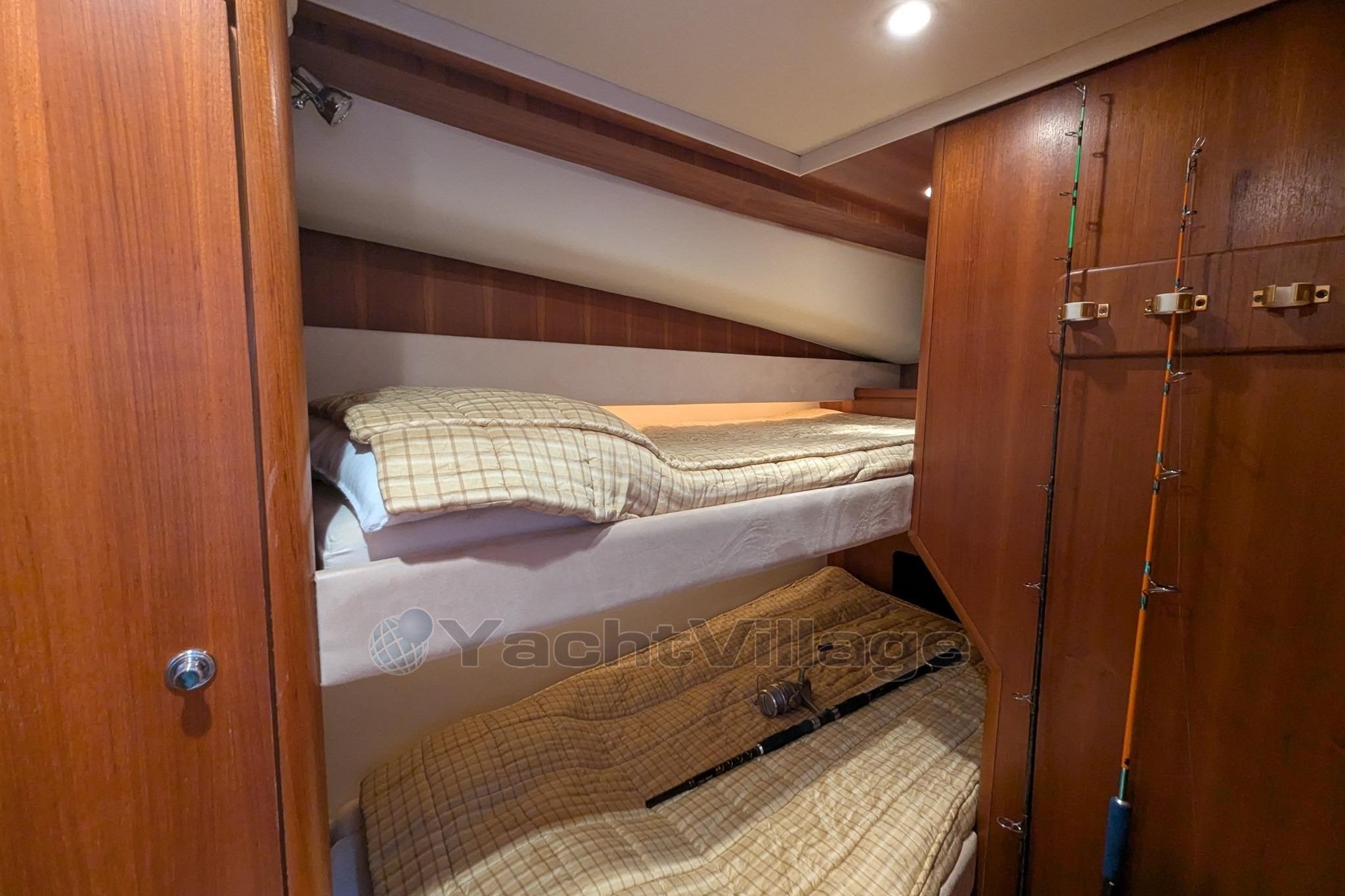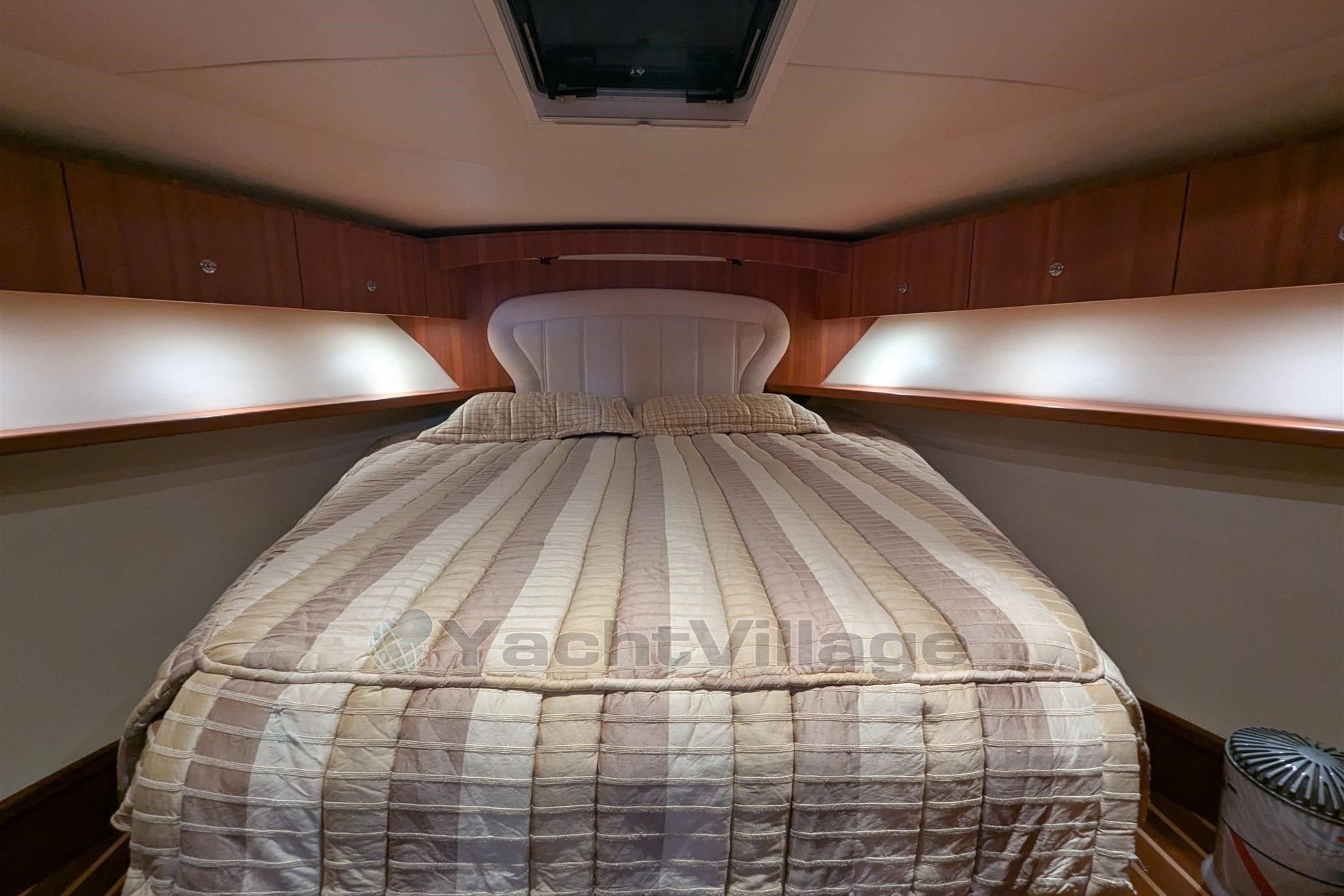 La zona notte comprende due cabine — una armatoriale e una ospiti — e un ampio bagno con doccia separata, rifinito con materiali di qualità.