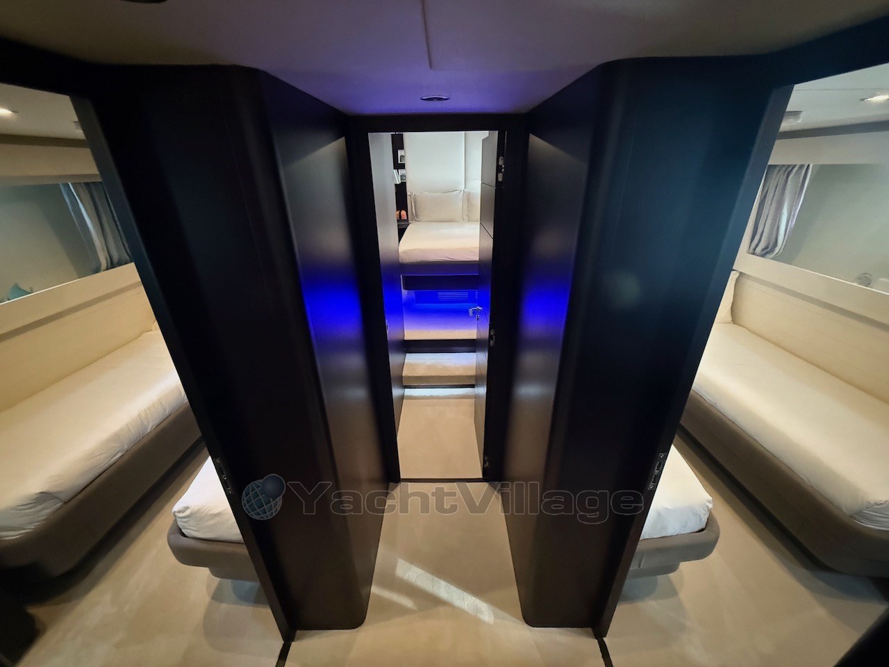 Cabina armatoriale con letto matrimoniale, cabina armadio e bagno (entrata alla cabina indipendente dal salone) - cabina Vip con letto matrimoniale e bagno - cabina ospiti con due letti in piano, terzo letto a scomparsa e bagno - cabina ospiti con due letti in piano, terzo letto a scomparsa e bagno.