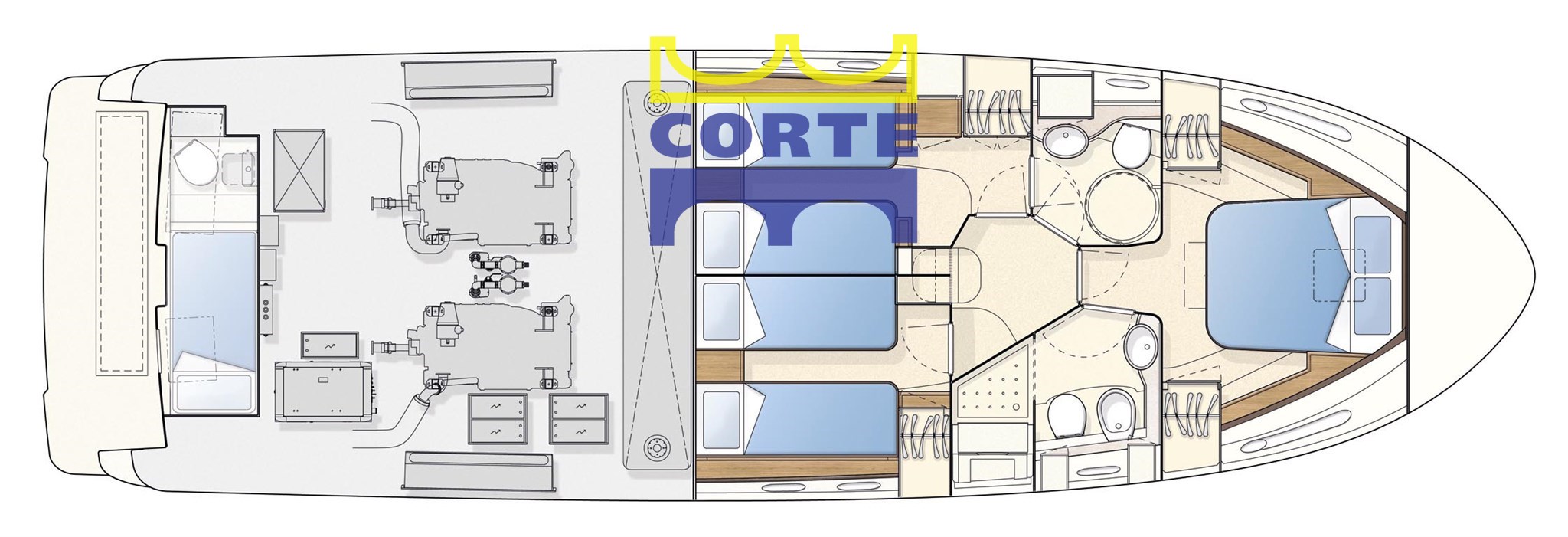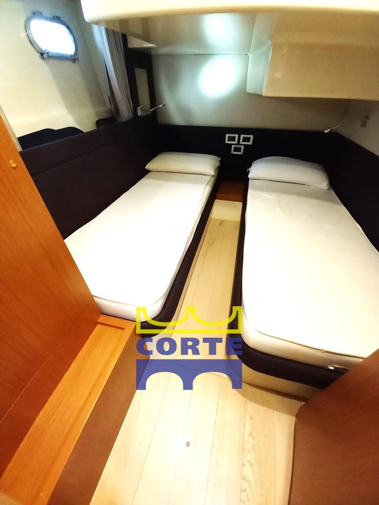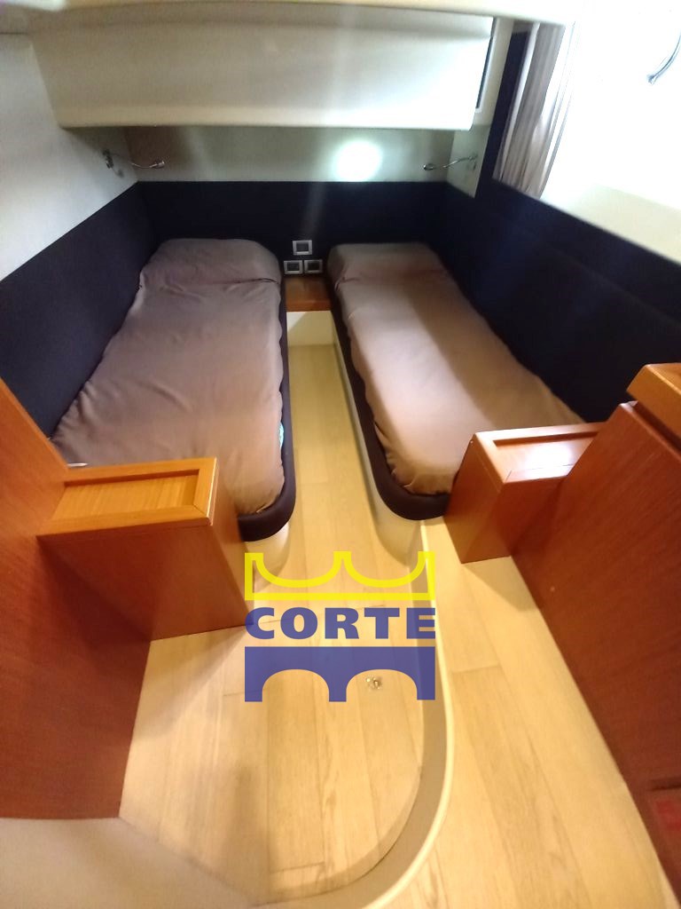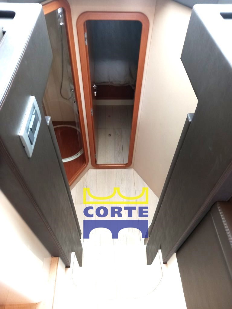 Cabina armatoriale matrimoniale a prua, due cabine a letti singoli piani, due bagni. Vano cabina equipaggio con bagno, attualmente con lavatrice e dissalatore
