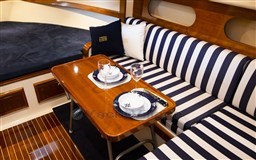 Dinette con divano convertibile e tavolino con copertura in mogano, cabina a prua con letto matrimoniale, bagno separato con doccia, angolo cottura con fornello a gas, lavandino e frigo con congelatore, comodo pozzetto con sedile pilota e divano, ulteriore seduta a prua con prendisole.