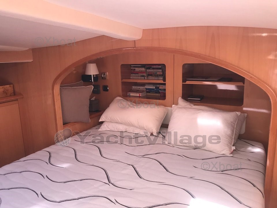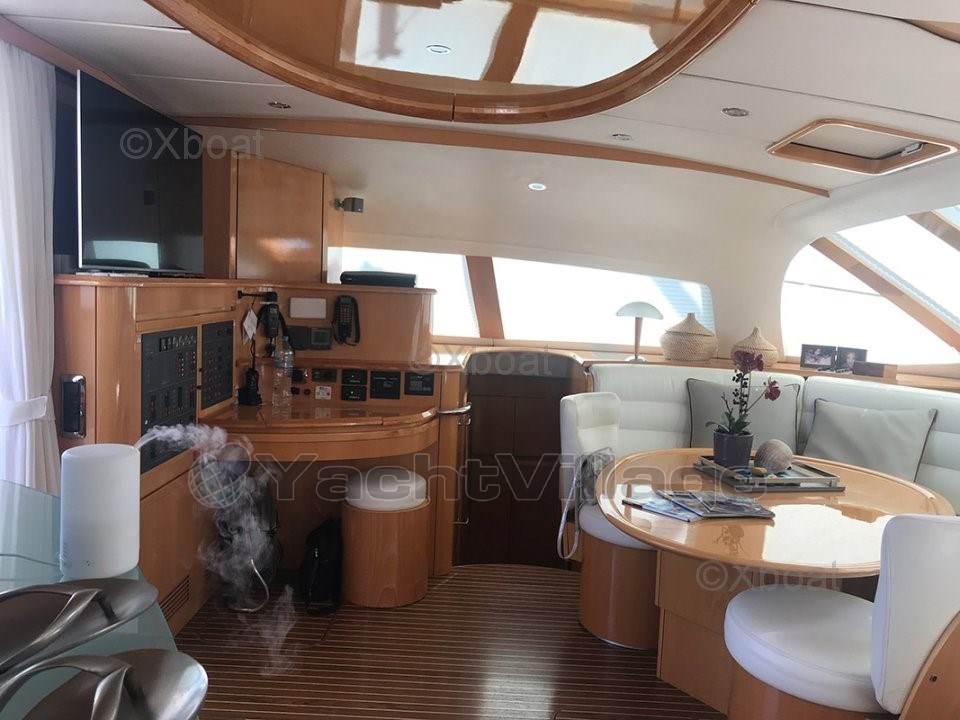 La cucina è completamente attrezzata nello scafo di dritta con accesso diretto alla zona equipaggio a prua, 2 cabine doppie VIP a poppa e, naturalmente, la splendida suite armatoriale con un ampio spogliatoio, una zona ufficio e la famosa cabina centrale con il suo grande letto su rostro...
