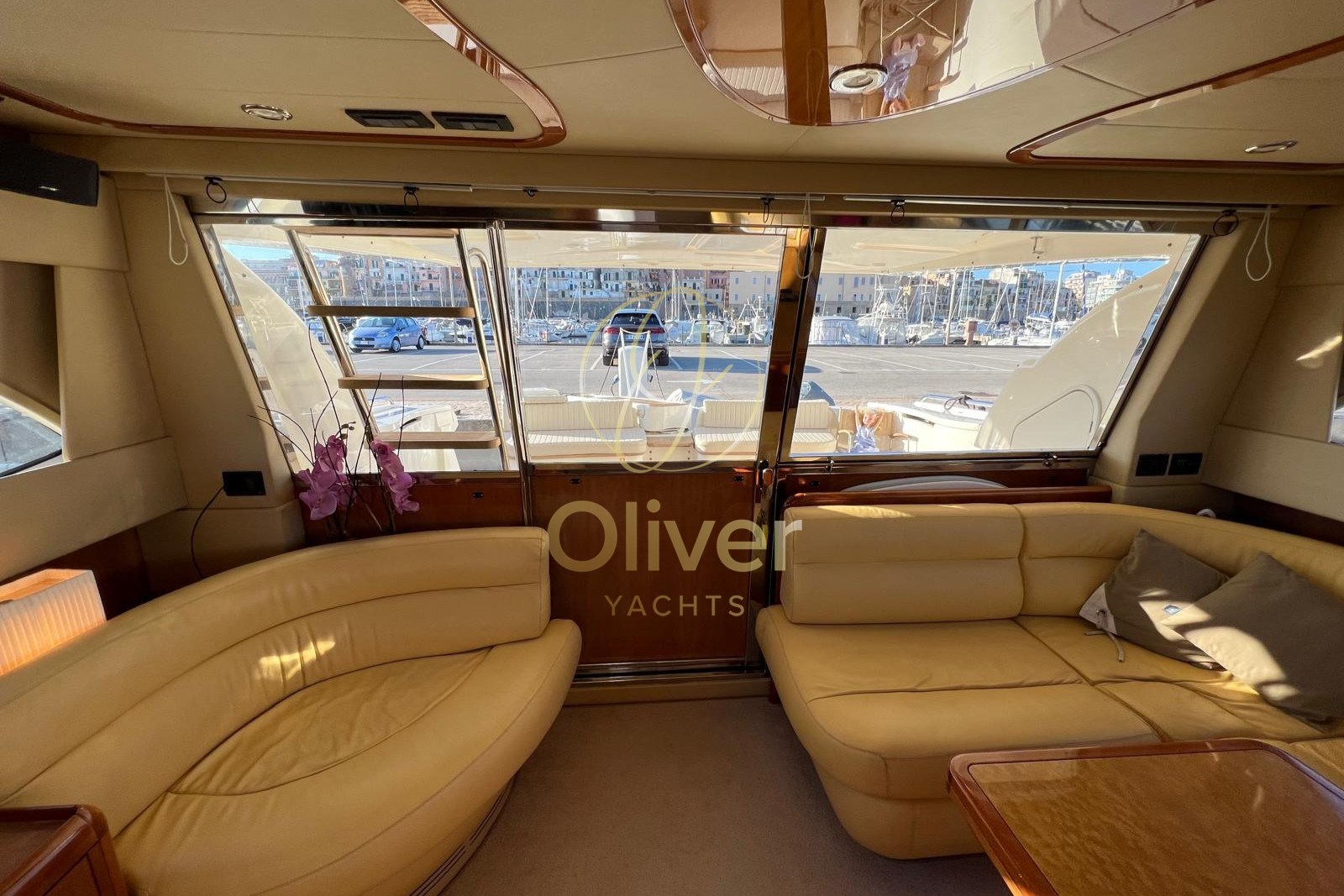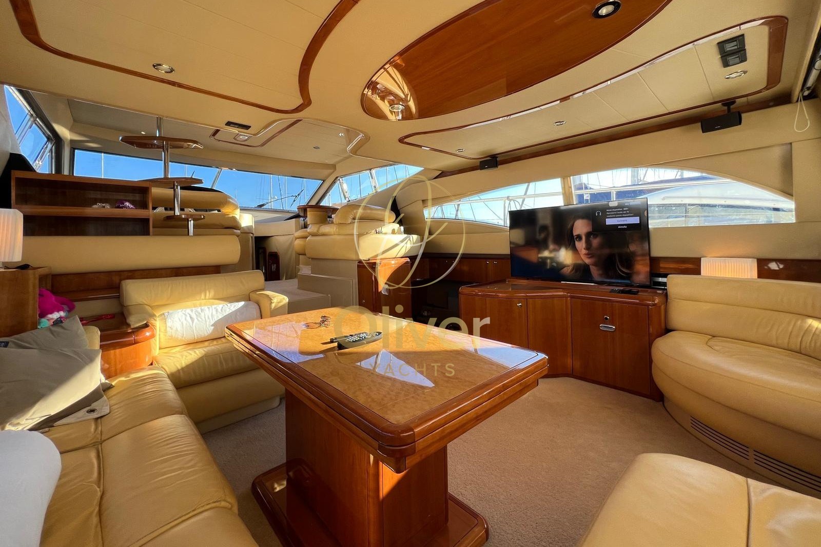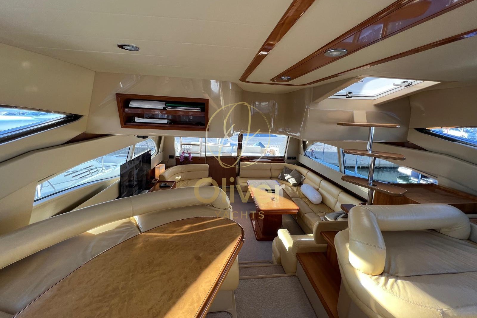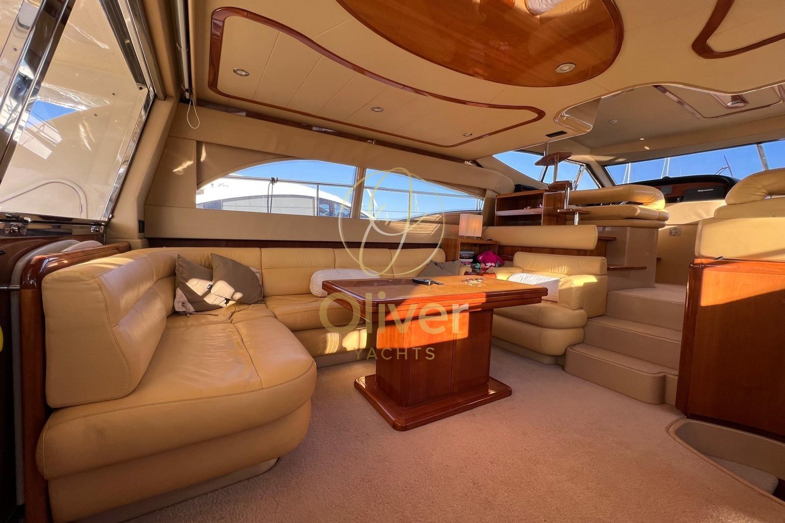Gli interni del Ferretti 590 colpiscono per luminosità, ampiezza e atmosfera elegante, tipica della produzione Ferretti. Il salone è ampio e accogliente, con divani contrapposti, zona pranzo ben separata e grandi superfici vetrate che garantiscono luce naturale e vivibilità anche in rada o in porto.