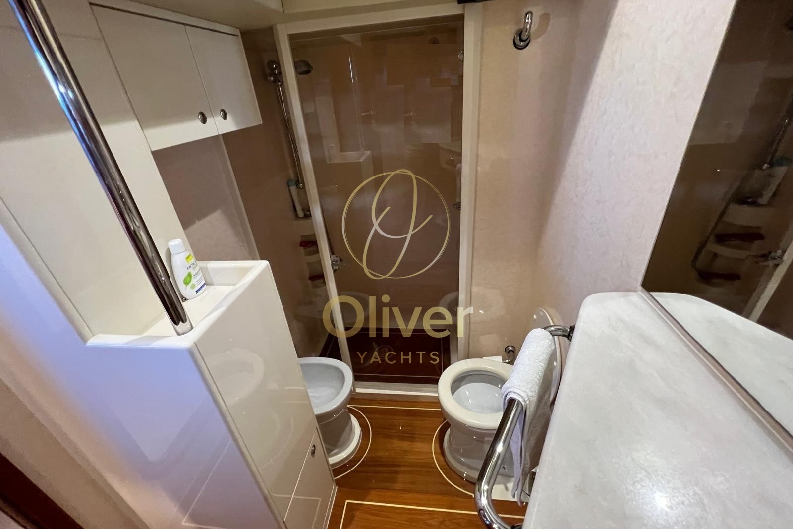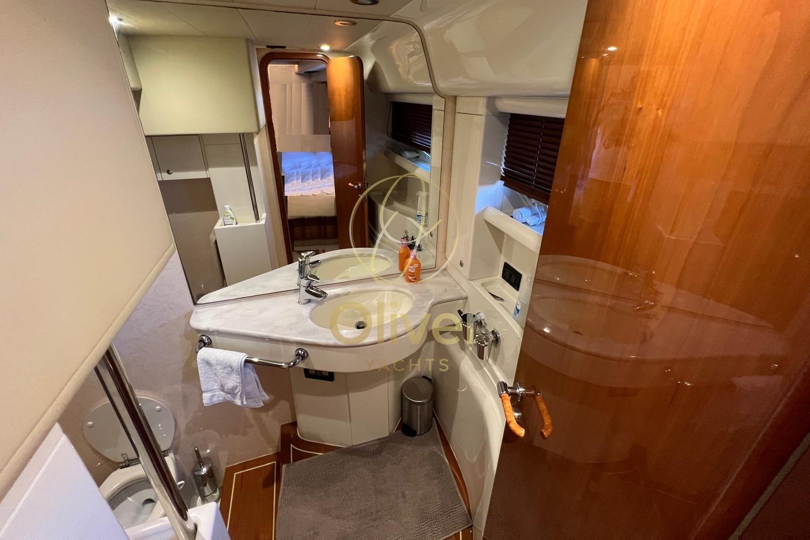 La cucina è completa e funzionale, dotata di lavastoviglie, lavasciuga e microonde, una configurazione ideale sia per uso armatoriale che per lunghe crociere. La zona notte offre cabine spaziose e ben isolate, con cabina armatoriale full-beam, bagno privato con box doccia separato e finiture di qualità. Le cabine ospiti mantengono lo stesso standard di comfort, con bagni dedicati e ottima altezza interna.