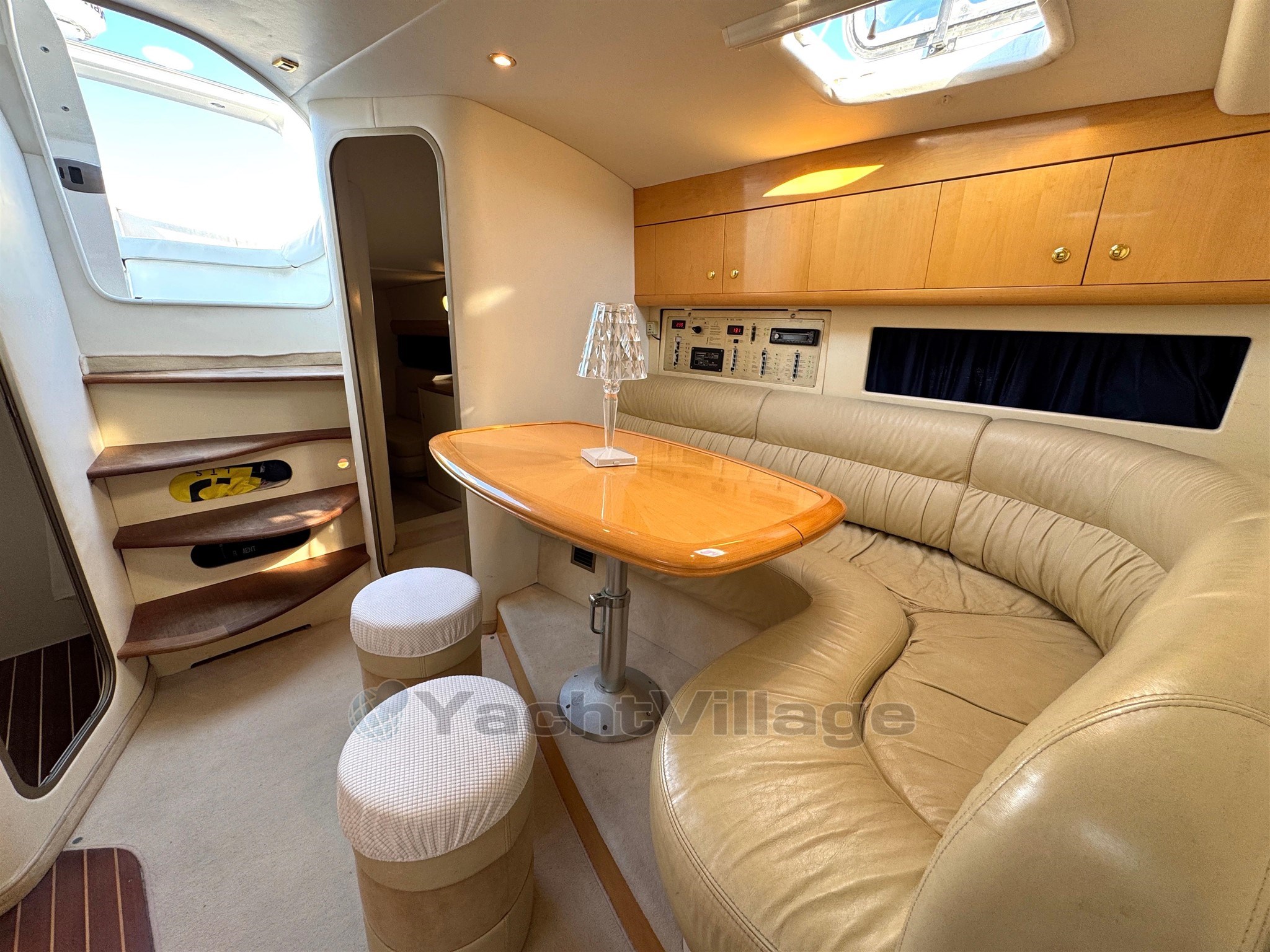 All'interno grande sofà a "L" di fronte alla cucina attrezzata con lavabo, frigorifero piano cottura a gas, etc, cabina a prua matrimoniale con armadi e cassetti, cabina doppia a poppa con divano interno ed armadio, bagno con lavabo, doccia e wc elettrico, etc...