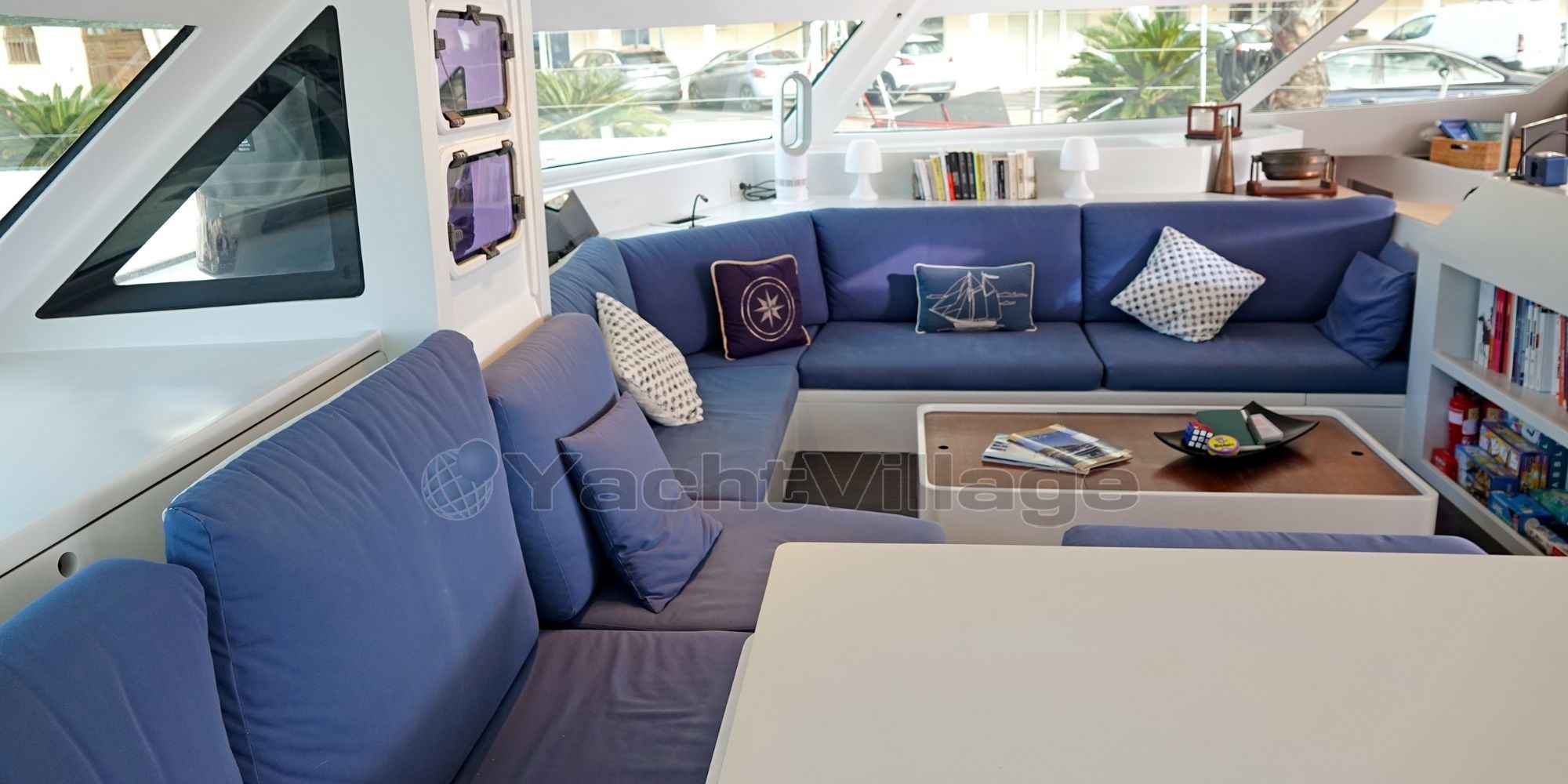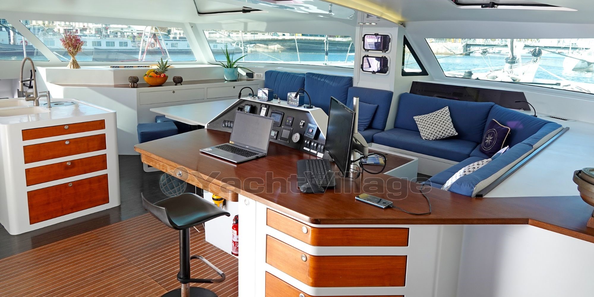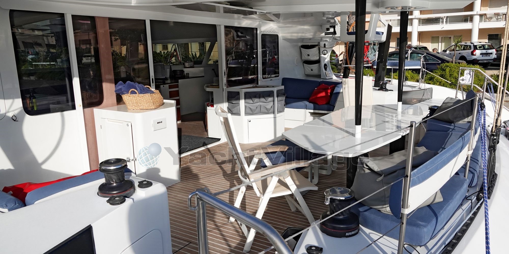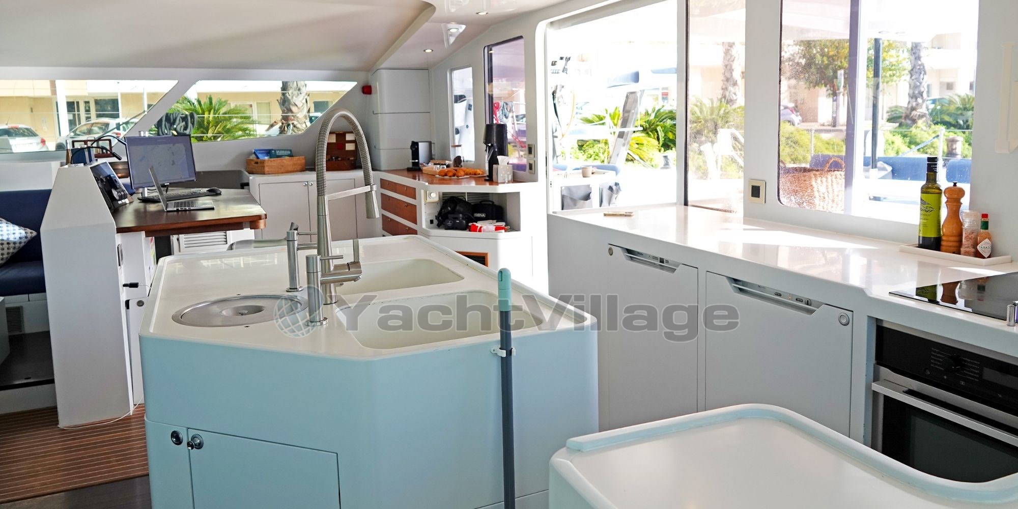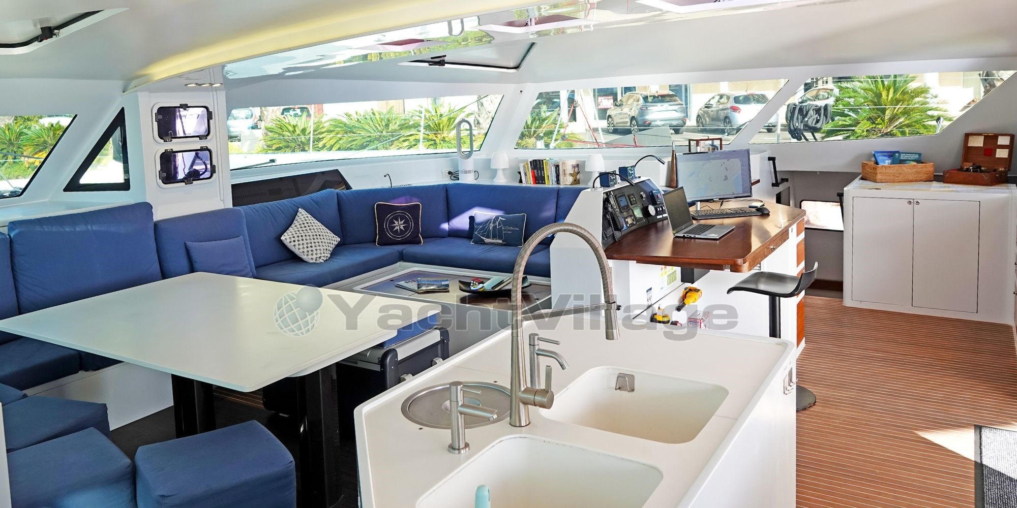 The interior layout is bright and functional, designed to accommodate up to 8 guests in 4 double cabins, along with 3 crew members in 2 separate cabins. The main salon offers a 360° panoramic view, a dining area, a fully equipped galley, and a relaxing lounge. The spacious aft cockpit features a dining table, a sofa for 4, and dual carbon helm stations for optimal control and visibility under sail.