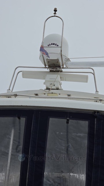 Used aft cabin yacht with crane on flybridge, microwave, superstructure is foil-wrapped.
