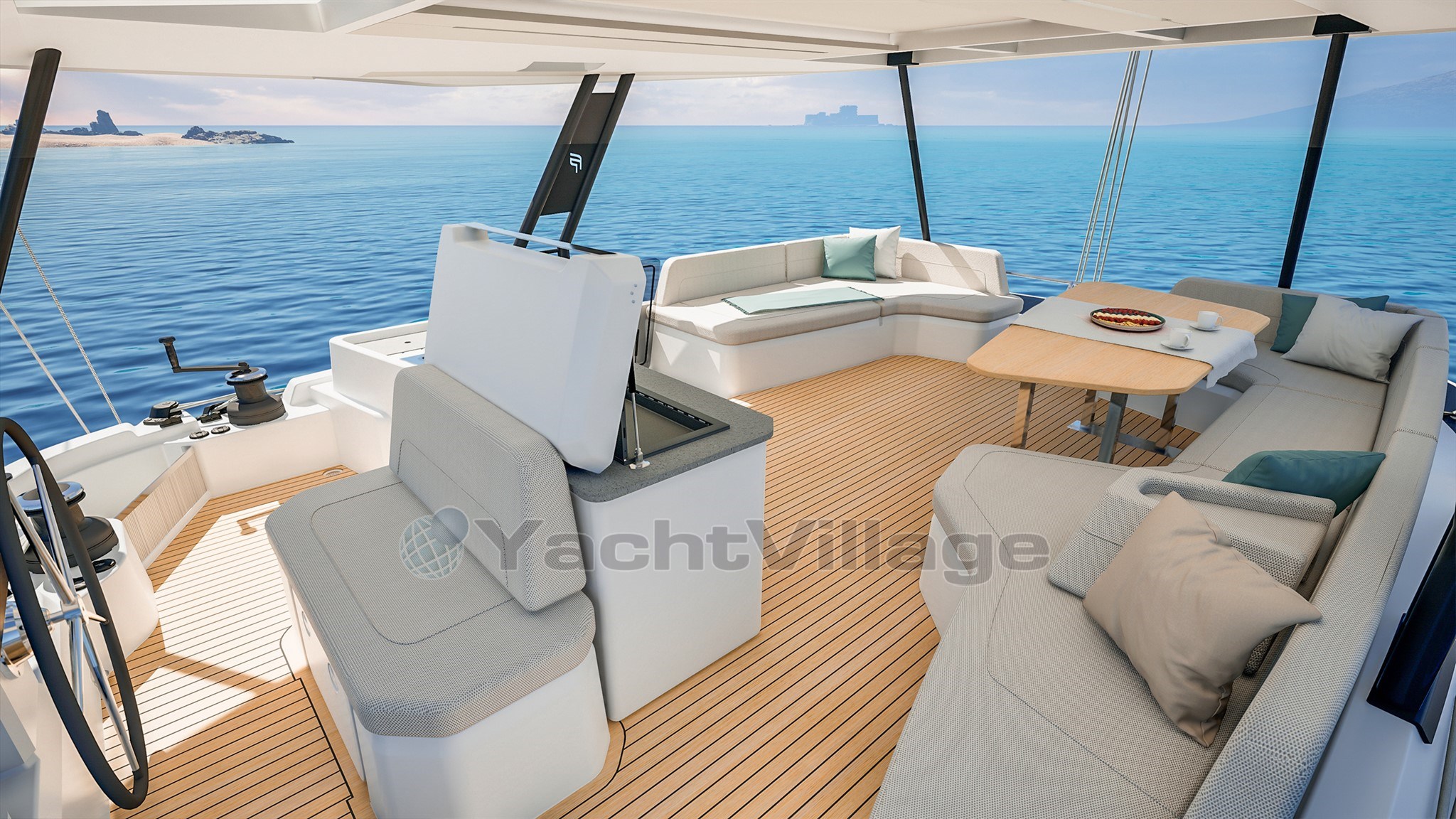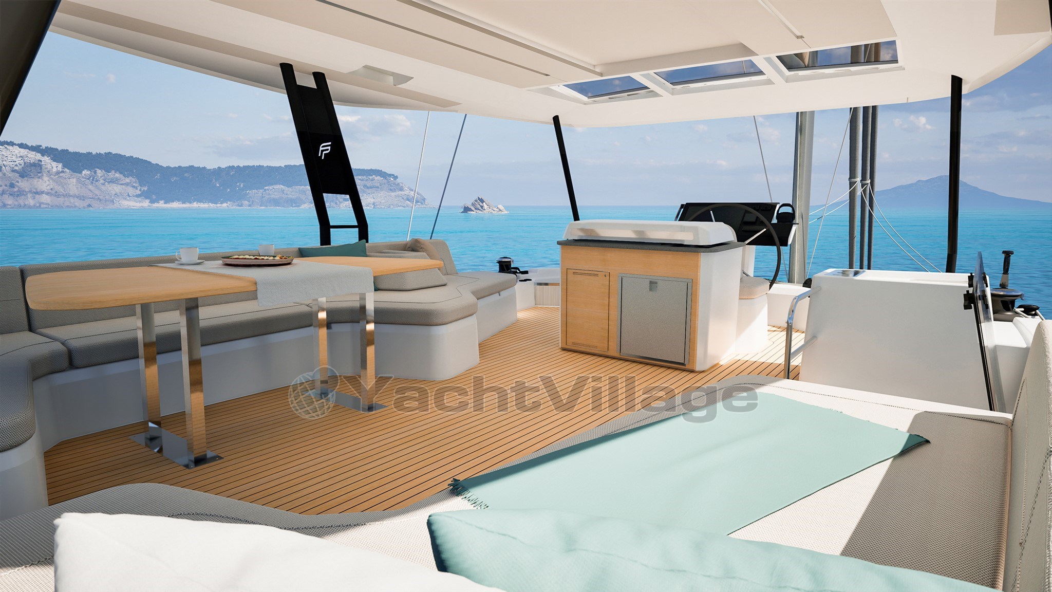 Unique in its category, the FP 55 is also the first catamaran in the range to feature a large flybridge with a centralized helm station, bringing together all maneuvers while offering a panoramic 360° view. For its size, the FP 55 is the only catamaran to offer two identical owner’s suites, located in each hull, while still maintaining two independent and fully equipped crew cabins.