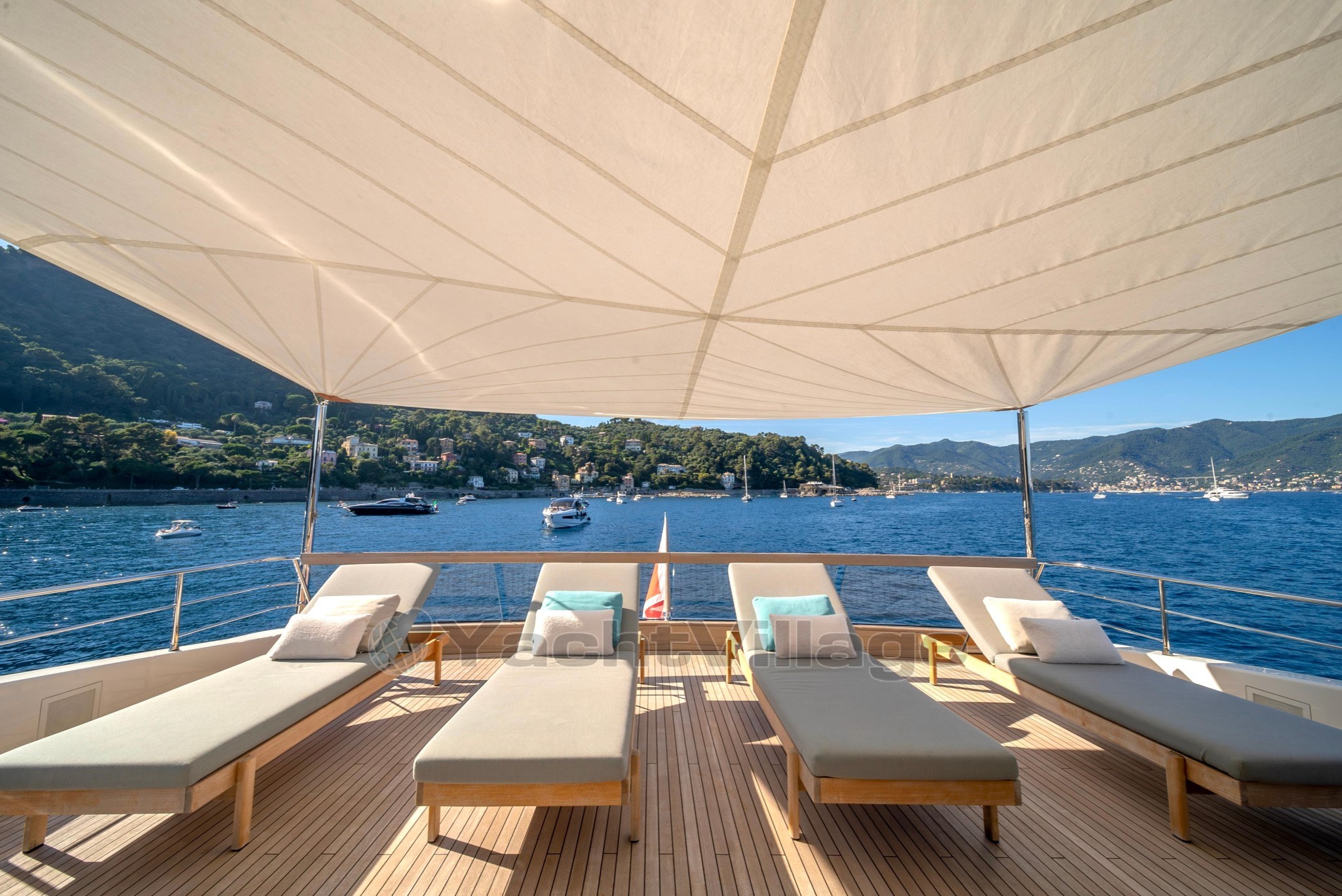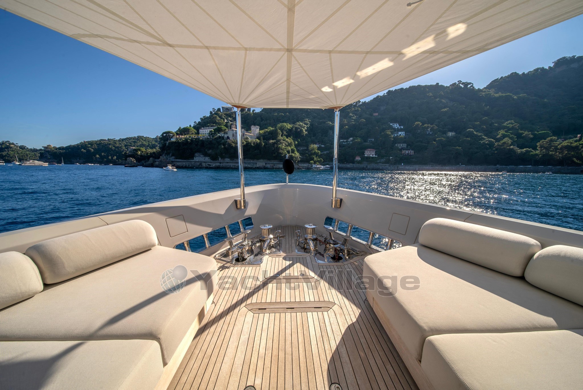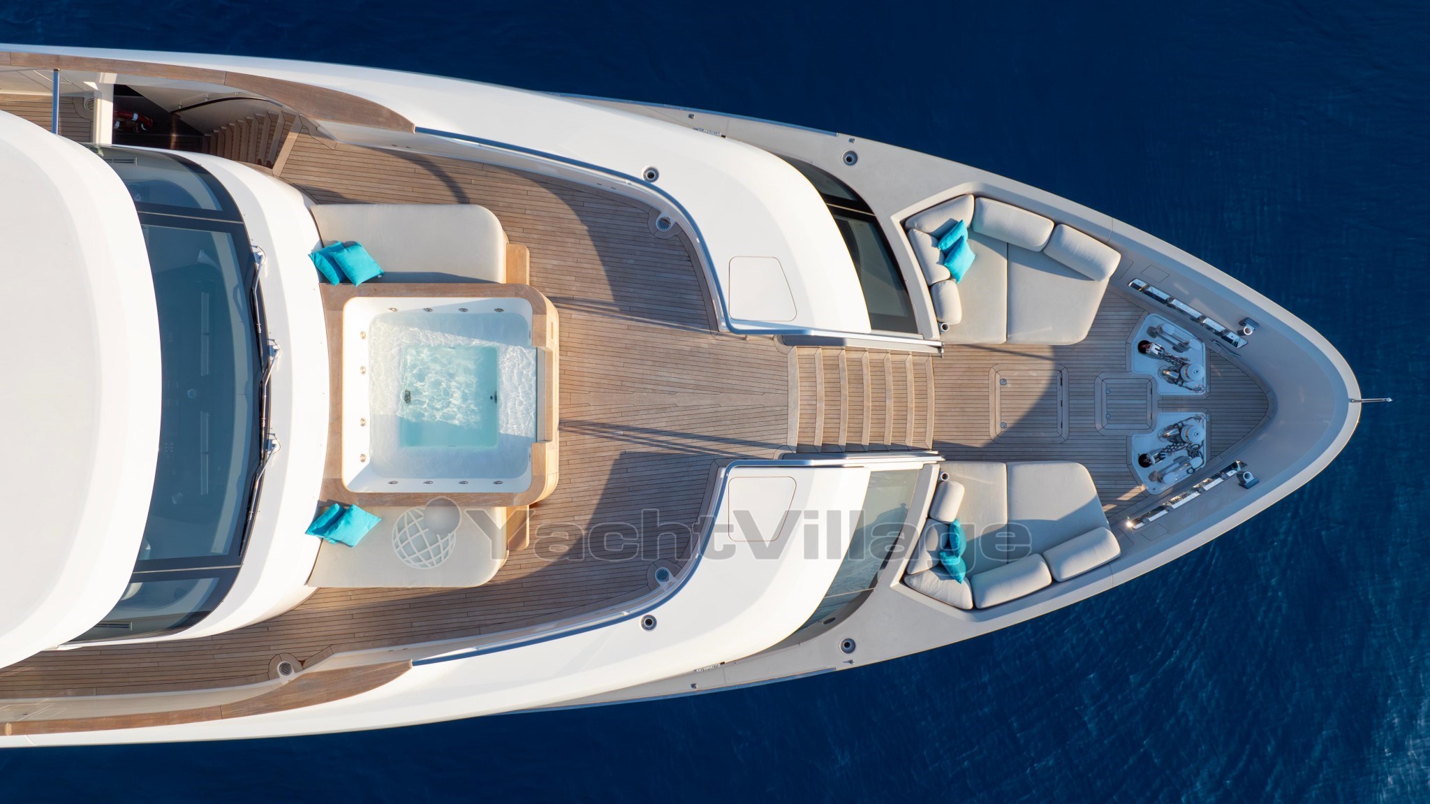 На передней палубе гости увидят красиво оформленное двухуровневое расположение: на верхнем уровне есть современное джакузи и солнечные подкладки, а на нижнем — удобные лаунж-кресла, идеально подходящие для уединения и панорамных видов на якоре.