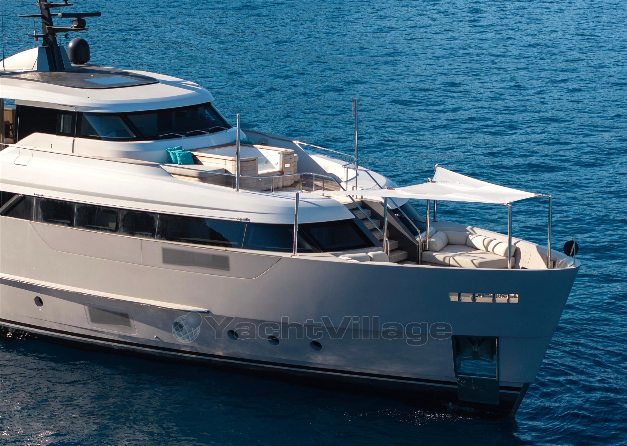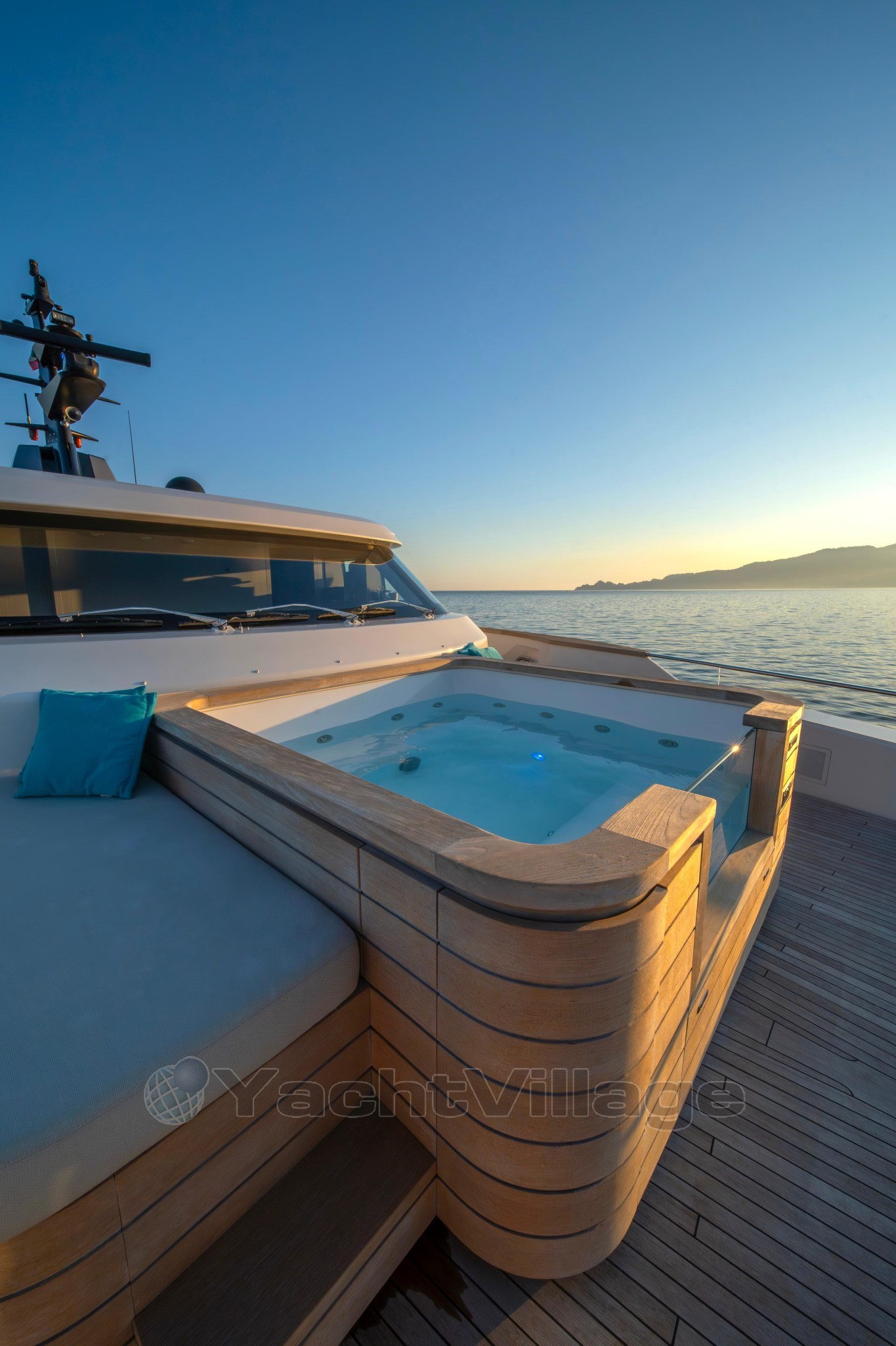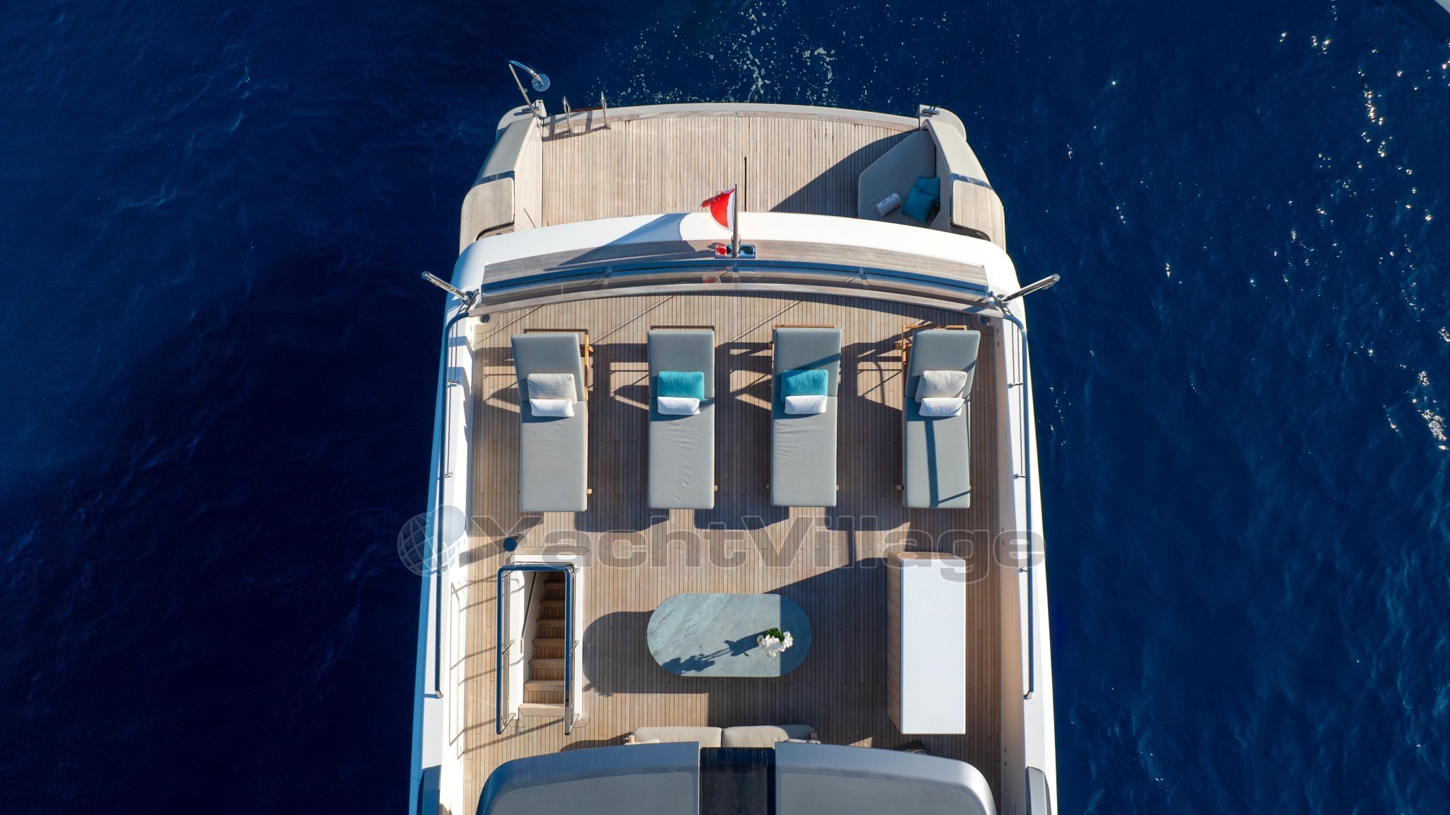 На передней палубе гости увидят красиво оформленное двухуровневое расположение: на верхнем уровне есть современное джакузи и солнечные подкладки, а на нижнем — удобные лаунж-кресла, идеально подходящие для уединения и панорамных видов на якоре.