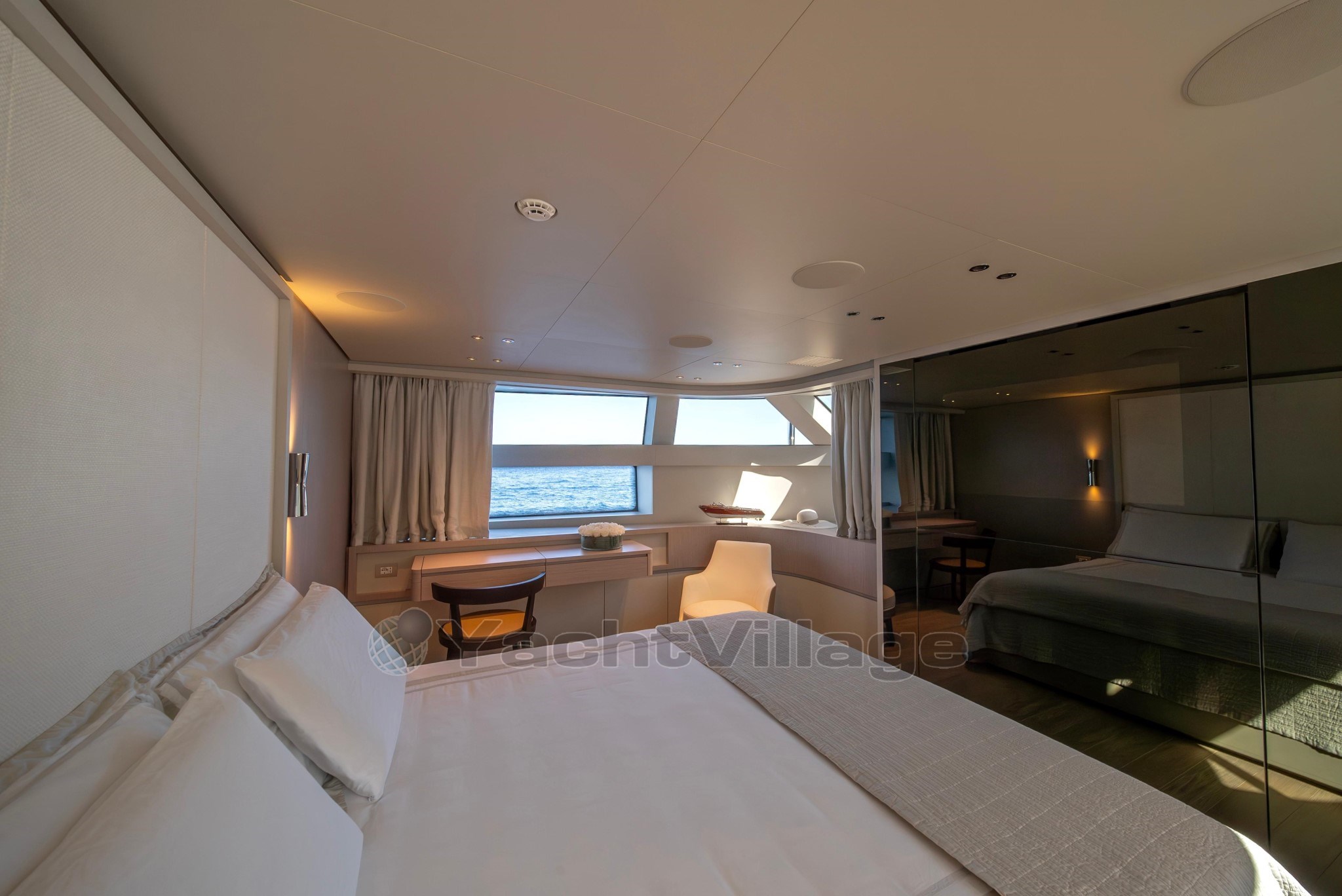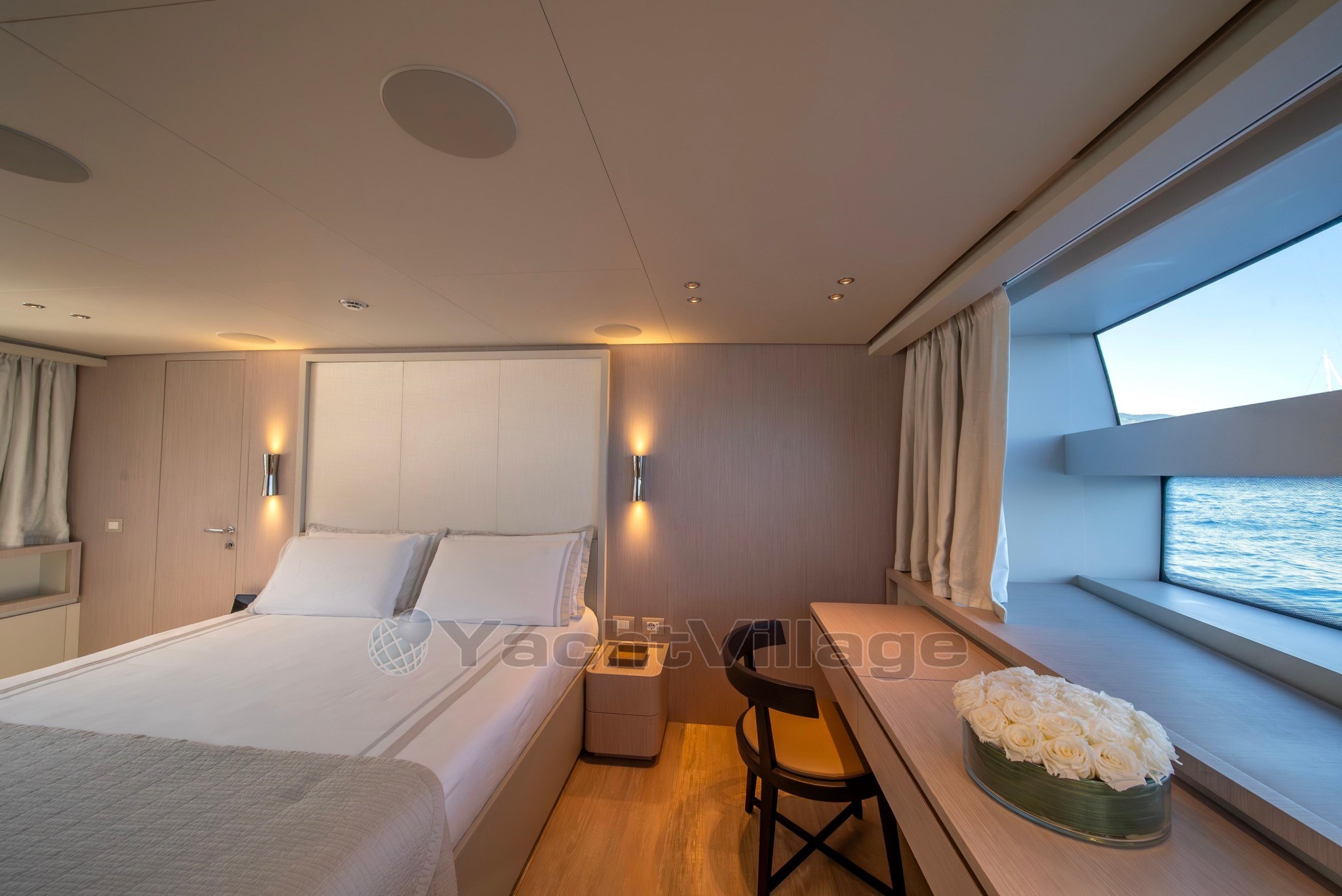В главном салоне есть угловой лаунж с большим диваном и редкими креслами, идеально подходящим для непринуждённых встреч или тихого отдыха. Слева вы найдёте полностью оборудованный камбуз и удобный дневной нос, а главная люкс расположена в передней части главной палубы, доступная через частный вход с правого борта, что обеспечивает и конфиденциальность, и комфорт.