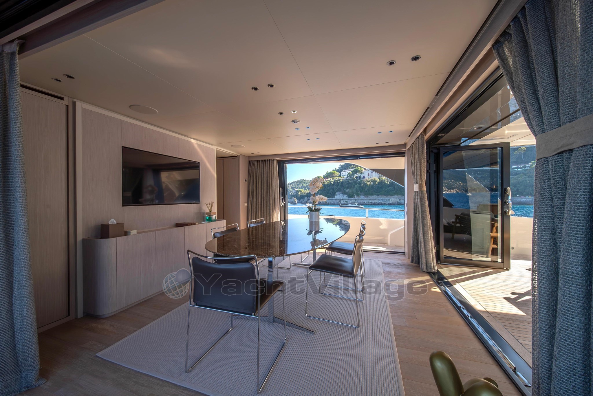 На верхней палубе салон служит формальной столовой яхты, плавно открываясь на внешнюю кормовую палубу через широкие раздвижные стеклянные двери, создавая плавное пространство внутри-наружу. Впереди на том же уровне находится рулевая рубка, предоставляющая гостям возможность наблюдать за навигацией и погрузиться в круизный опыт.