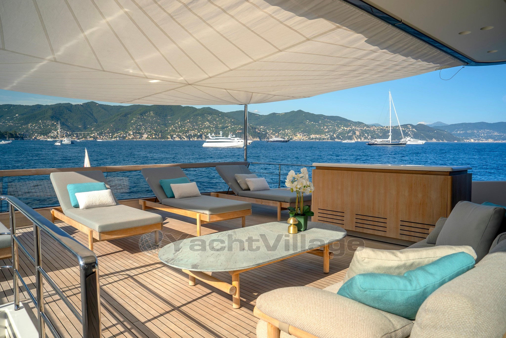Защищённое навесом верхней палубы, это пространство обеспечивает отличную защиту от погодных условий и открывает свободный вид на корму.