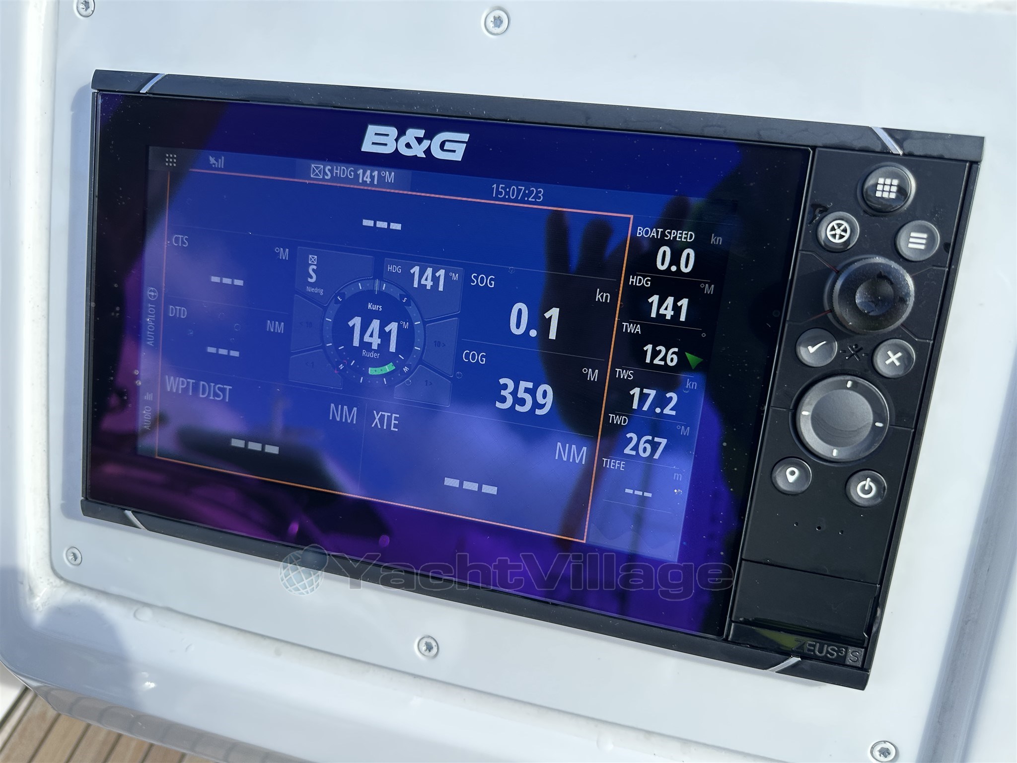 B&G Zeus3S 9" chart plotter with integrated GoFree Wi-Fi; all-weather touch screen and expanded keypad at cockpit table