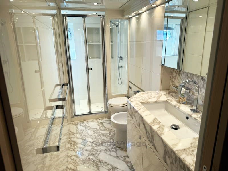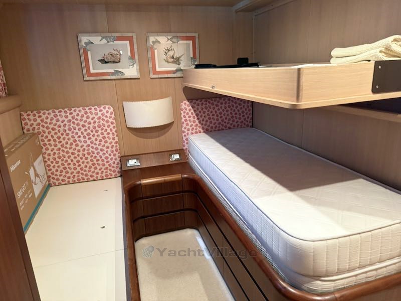 Нижняя палуба выделена под спальную зону следующим образом: каюта владельца с полной шириной в центре корпуса с уголком для отдыха, офисной зоной, раздевалкой и собственной ванной комнатой; Две гостевые каюты с зеркальными куточками с плоскими кроватями и выдвижными кроватями Pullman, а в носовой части находится VIP-каюта. Все они оснащены отдельными ванными комнатами. В самом носу, через люк с главной палубы, есть доступ в комнату экипажа, состоящую из каюты с двумя койками и туалетом.