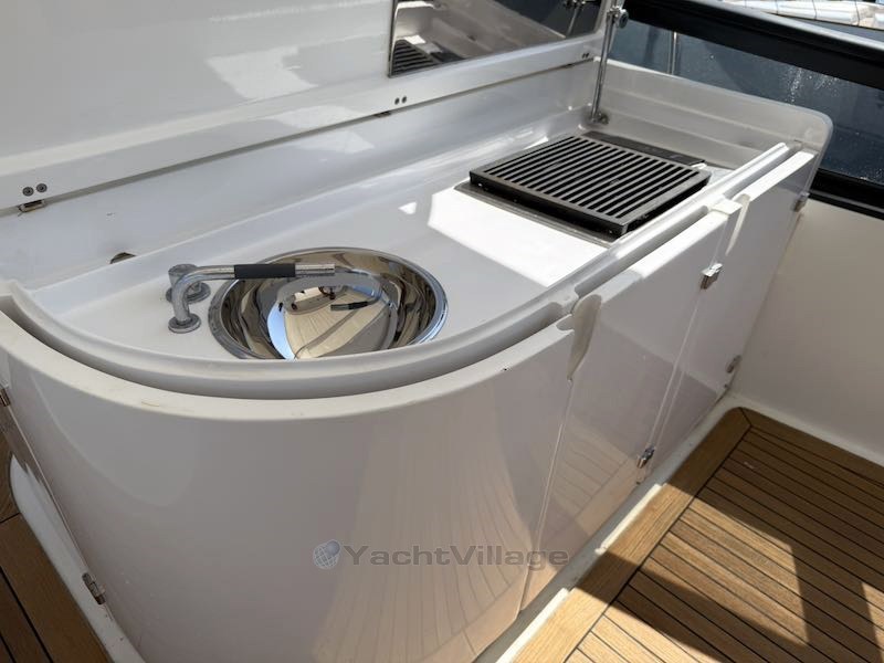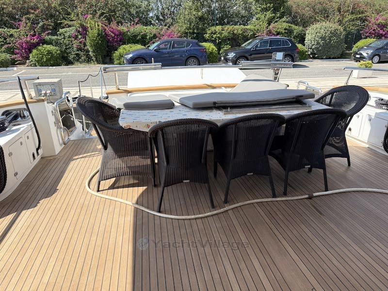 Флайбридж предназначен для жизни на открытом воздухе, хотя он защищён навесом с каркастом. На этой палубе, начиная с кормы, есть большая зона для загара, третья столовая и внешняя рулевая рубка для приятного открытого драйва