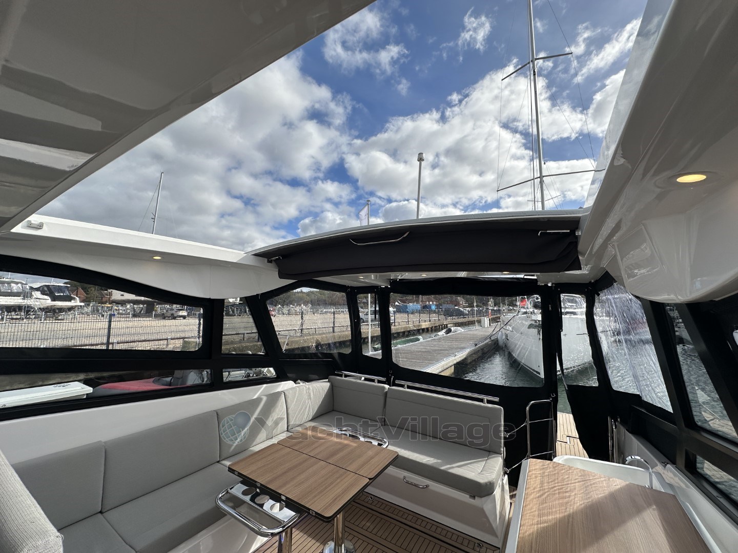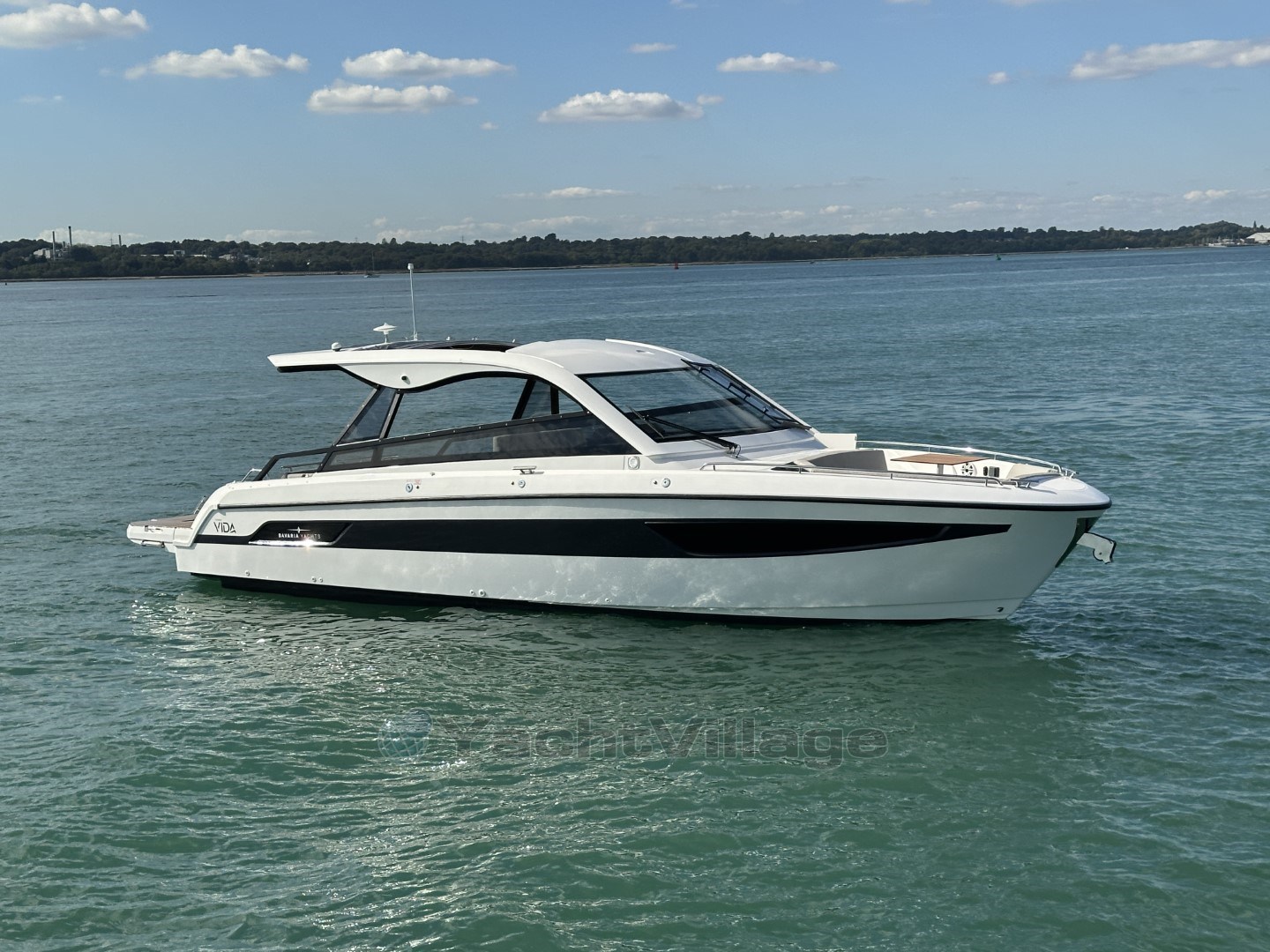 This new Bavaria Vida 33 Hard Top has just arrived with us at Swanwick Marina and will be debuted at the upcoming Southampton International Boatshow. She has a great specification, including the optional foredeck seating area, full camper hood, wrap-around bathing platform with Esthec decking, twin 9" GPS/Plotters, Gas cockpit bbq etc.
