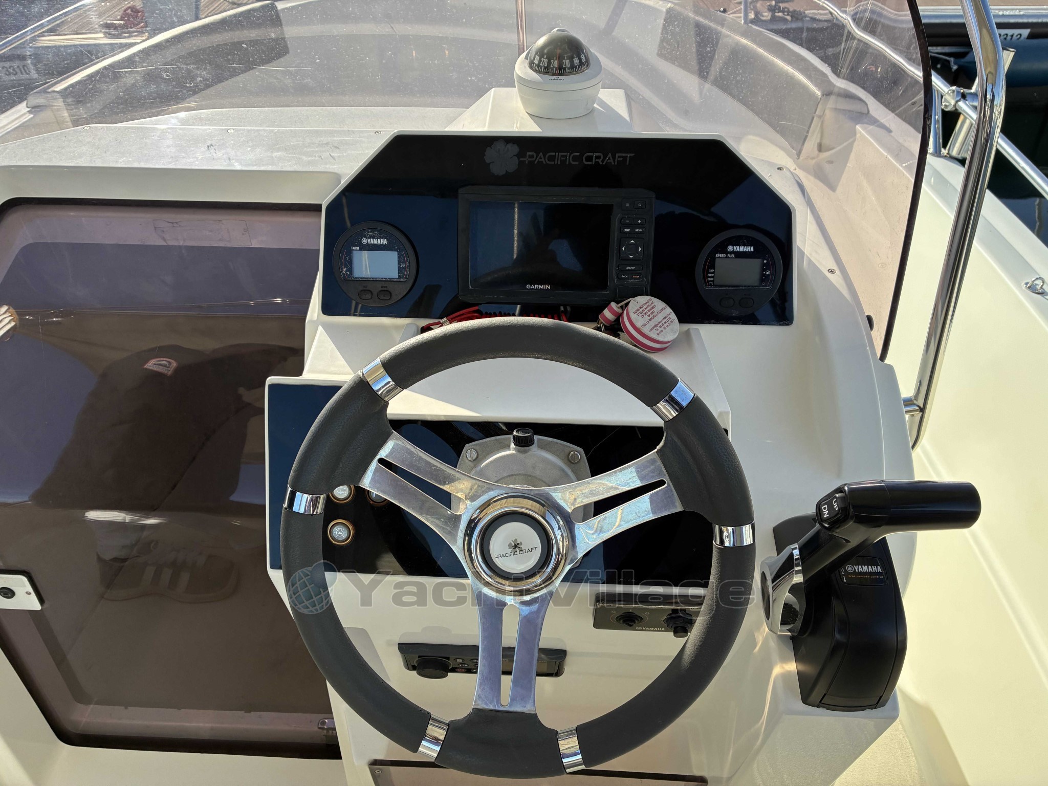 For comfort and safety, it is equipped with a bimini, a Garmin GPS fishfinder, and hydraulic steering that ensures smooth and enjoyable navigation. The safety equipment is complete and ready to use.